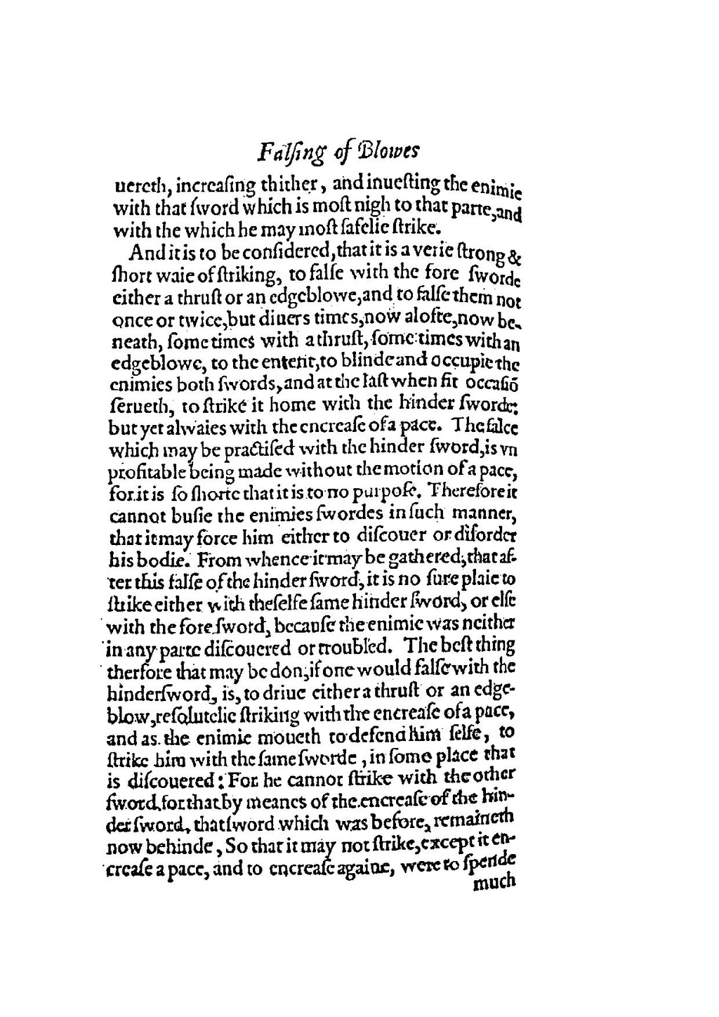 And it is to be considered, that it is a verie strong & short waie of striking, to false with the fore sworde either a thrust or an edgeblowe, and to false them not once or twice, but diuers times, now alofte, now beneath, some times with a thrust, some times with an edgeblowe, to the entent, to blinde and occupie the enimies both swords, and at the last when fit occasiō serueth, to strike it home with the hinder sworde: but yet alwaies with the encrease of a pace. The falce which may be practised with the hinder sword, is vn profitable being made without the motion of a pace, for it is so shorte that it is to no purpose. Therefore it cannot busie the enimies swordes in such manner, that it may force him either to discouer or disorder his bodie. From whence it may be gathered, that after this false of the hinder sword, it is no sure plaie to strike either with theselfe same hinder sword, or else with the fore sword; because the enimie was neither in any parte discouered or troubled. The best thing therfore that may be don, if one would false with the hindersword, is, to driue either a thrust or an edgeblow, resolutelie striking with the encrease of a pace, and as the enimie moueth to defend him selfe, to strike him with the same sworde, in some place that is discouered: For he cannot strike with the other sword for that by meanes of the encrease of the hinder sword, that sword which was before, remaineth now behinde, So that it may not strike, except it encrease a pace, and to encrease againe, were to spende