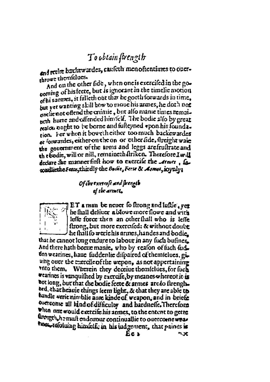 And on the other side, when one is exercised in the gouerning of his feete, but is ignorant in the timelie motion of his armes, it falleth out that he goeth forwards in time, but yet wanting skill how to moue his armes, he doth not onelie not oftend the enimie, but also manie times remaineth hurte and oftended himself. The bodie also by great reason ought to be borne and susteyned vpon his foundation. For when it boweth either too much backewardes or forwardes, either on the on or other side, streight waie the gouernment of the arms and leggs are frustrate and the bodie, will or nill, remaineth striken. Therefore I will declare the manner first how to exercise the Armes, secondliethe Feete, thirdly the Bodie, Feete & Armes, ioynly: