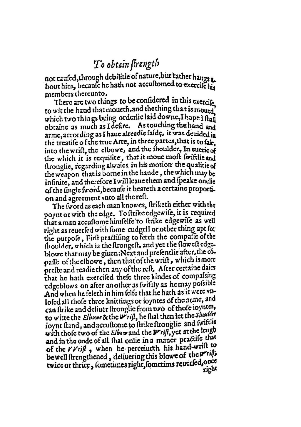 The sword as each man knowes, striketh either with the poynt or with the edge. To strike edgewise, it is required that a man accustome himselfe to strike edgewise as well right as reuersed with some cudgell or other thing apt for the purpose, First practising to fetch the compasse of the shoulder, which is the strongest, and yet the slowest edgeblowe that may be giuen: Next and presentlie after, the cōpasse of the elbowe, then that of the wrist, which is more preste and readie then any of the rest. After certaine daies that he hath exercised these three kindes of compassing edgeblows on after an other as swiftly as he may possible And when he feleth in him selfe that he hath as it were vnlosed all those three knittings or ioyntes of the arme, and can strike and deliuer stronglie from two of those ioyntes, to witte the Elbowe & the Wrist, he shal then let the Shoulder ioynt stand, and accustome to strike stronglie and swiftlie with those two of the Elbow and the Wrist, yet at the lengh and in the ende of all shal onlie in a maner practise that of the VVrist, when he perceiueth his hand-wrist to be well strengthened, deliuering this blowe of the Wrist, twice or thrice, sometimes right, sometims reuersed, once
