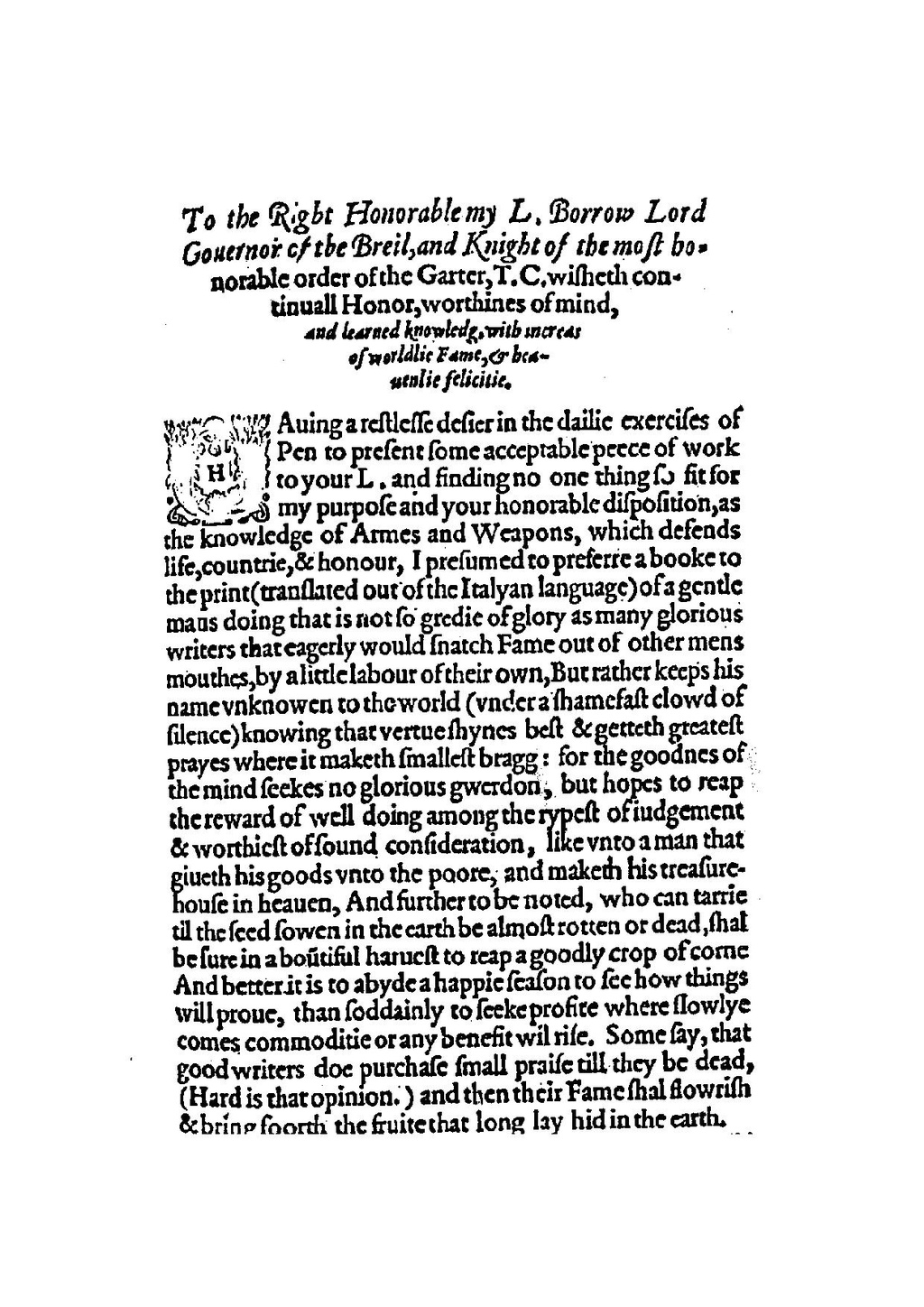 HAuing a restlesse desier in the dailie exercises of Pen to present some acceptable peece of work to your L. and finding no one thing so fit for my purpose and your honorable disposition, as the knowledge of Armes and Weapons, which defends life, countrie, & honour, I presumed to preferre a booke to the print (translated out of the Italyan language) of a gentle mans doing that is not so gredie of glory as many glorious writers that eagerly would snatch Fame out of other mens mouthes, by a little labour of their own, But rather keeps his name vnknowen to the world (vnder a shamefast clowd of silence) knowing that vertue shynes best & getteth greatest prayes where it maketh smallest bragg: for the goodnes of the mind seekes no glorious gwerdon, but hopes to reap the reward of well doing among the rypest of iudgement & worthiest of sound consideration, like vnto a man that giueth his goods vnto the poore, and maketh his treasurehouse in heauen, And further to be noted, who can tarrie til the seed sowen in the earth be almost rotten or dead, shal be sure in a boūtiful haruest to reap a goodly crop of corne And better it is to abyde a happie season to see how things will proue, than soddainly to seeke profite where slowlye comes commoditie or any benefit wil rise. Some say, that good writers doe purchase small praise till they be dead, (Hard is that opinion.) and then their Fame shal flowrish & bring foorth the fruite that long lay hid in the earth.