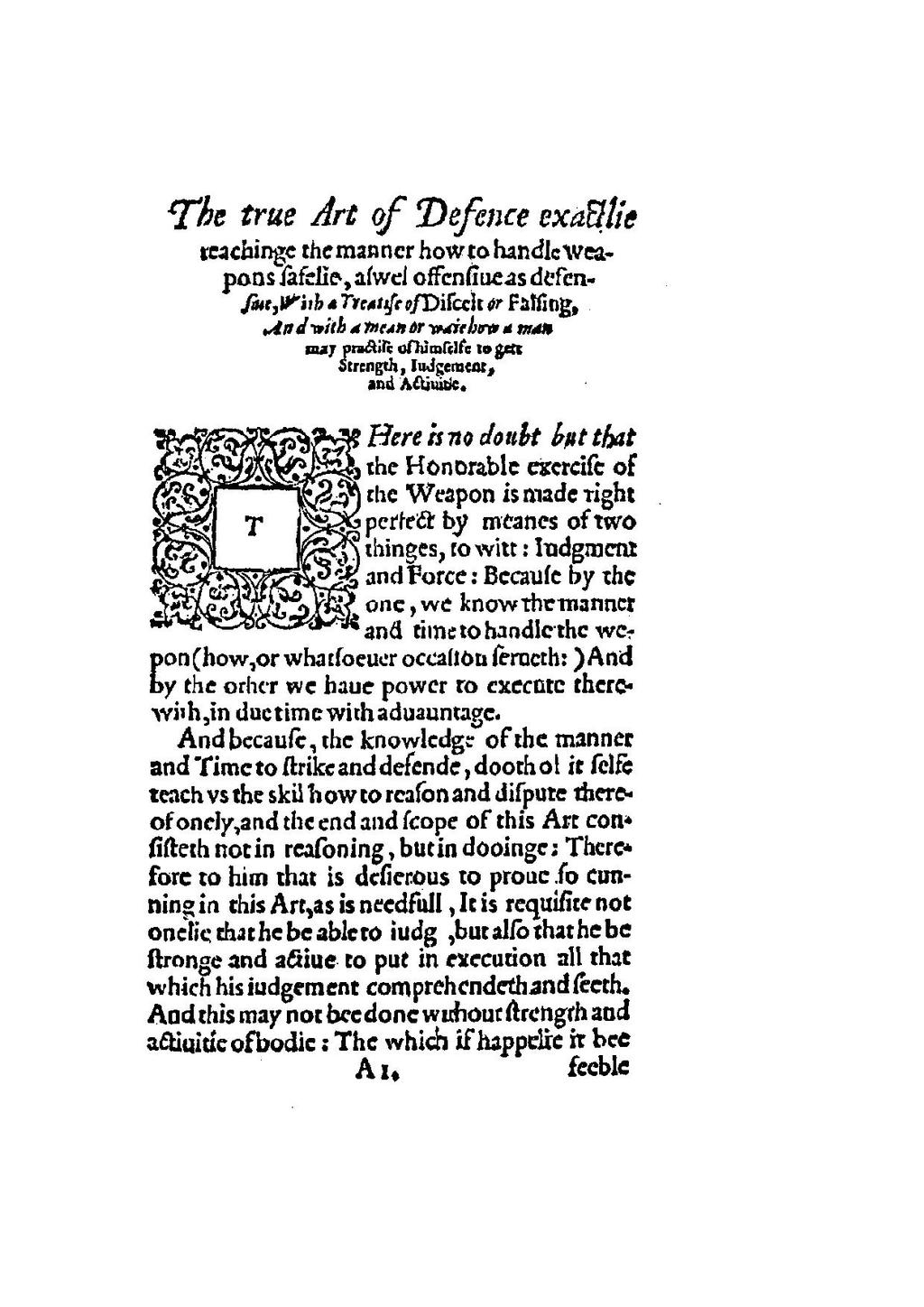 The true Art of Defence exactlie teachinge the manner how to handle weapons safelie, aswel offensiue as defensiue, With a Treatise of Disceit or Falsing, And with a mean or waie how a man may practise of himselfe to gett Strength, Iudgement, and Actiuitie.