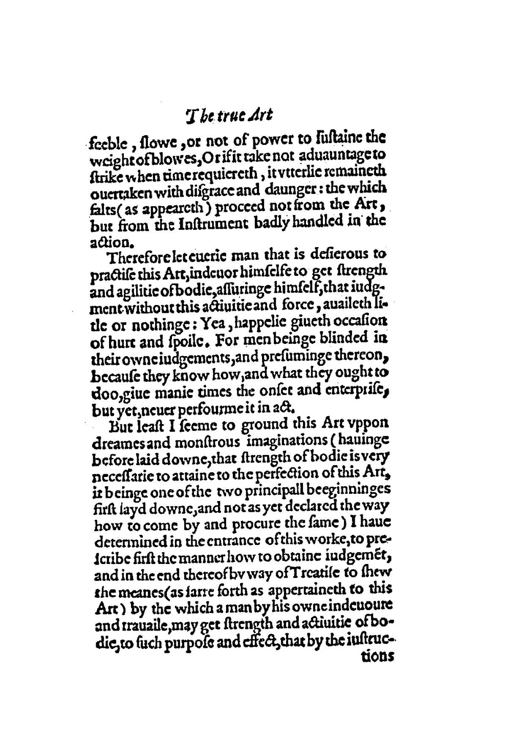 But least I seeme to ground this Art vppon dreames and monstrous imaginations (hauinge before laid downe, that strength of bodie is very necessarie to attaine to the perfection of this Art, it beinge one of the two principall beeginninges first layd downe, and not as yet declared the way how to come by and procure the same) I haue determined in the entrance of this worke, to prescribe first the manner how to obtaine iudgemēt, and in the end thereof by way of Treatise to shew the meanes (as farre forth as appertaineth to this Art) by the which a man by his owne indeuoure and trauaile, may get strength and actiuitie of bodie, to such purpose and effect, that by the iustruc-