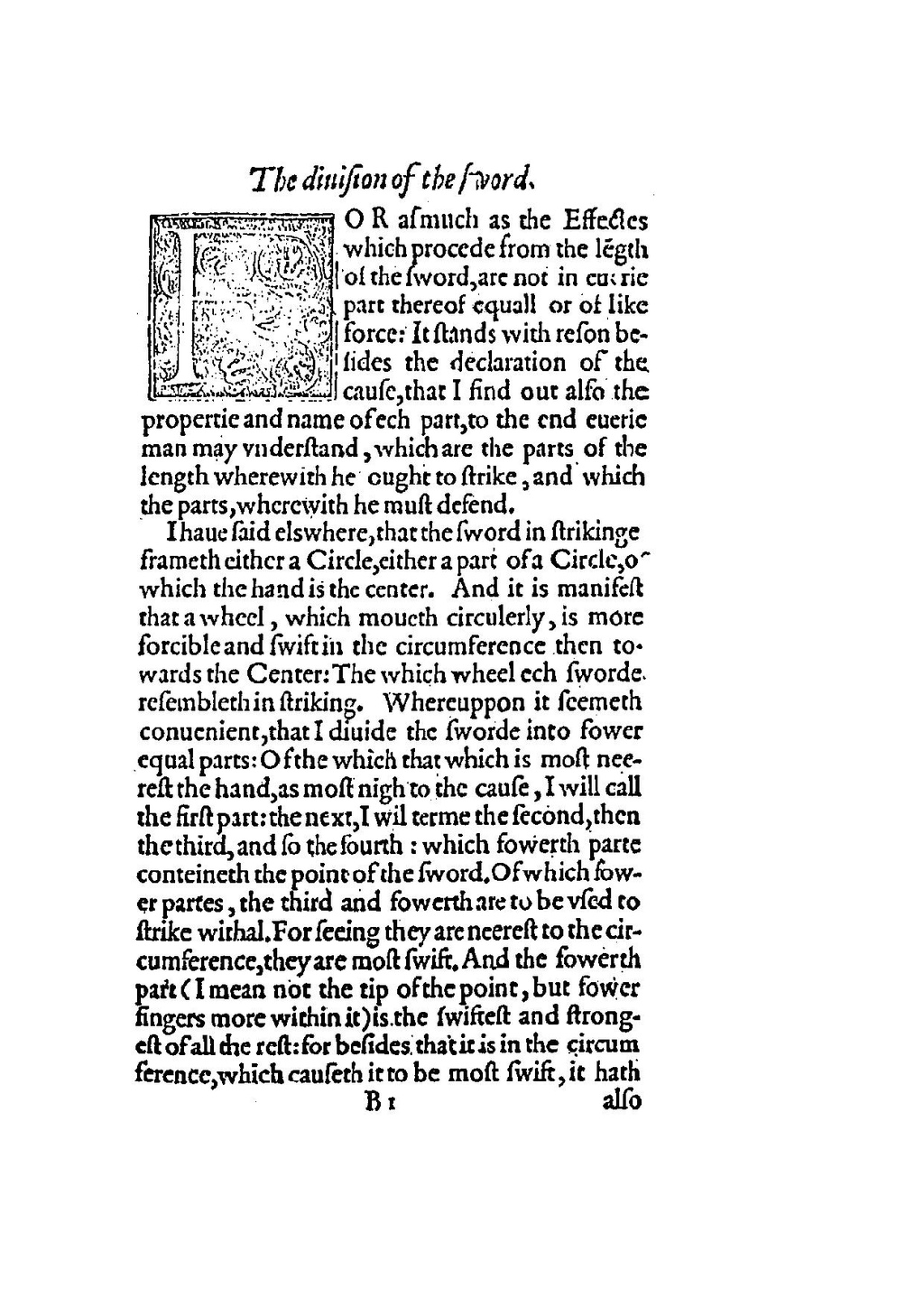 I haue said elswhere, that the sword in strikinge frameth either a Circle, either a part of a Circle, of which the hand is the center. And it is manifest that a wheel, which moueth circulerly, is more forcible and swift in the circumference then towards the Center: The which wheel ech sworde resembleth in striking. Whereuppon it seemeth conuenient, that I diuide the sworde into sower equal parts: Of the which that which is most neerest the hand, as most nigh to the cause, I will call the first part: the next, I wil terme the second, then the third, and so the fourth: which fowerth parte conteineth the point of the sword. Of which fower partes, the third and fowerth are to be vsed to strike withal. For seeing they are neerest to the circumference, they are most swift. And the fowerth part (I mean not the tip of the point, but fower fingers more within it) is the swiftest and strongest of all the rest: for besides that it is in the circum ference, which causeth it to be most swift, it hath