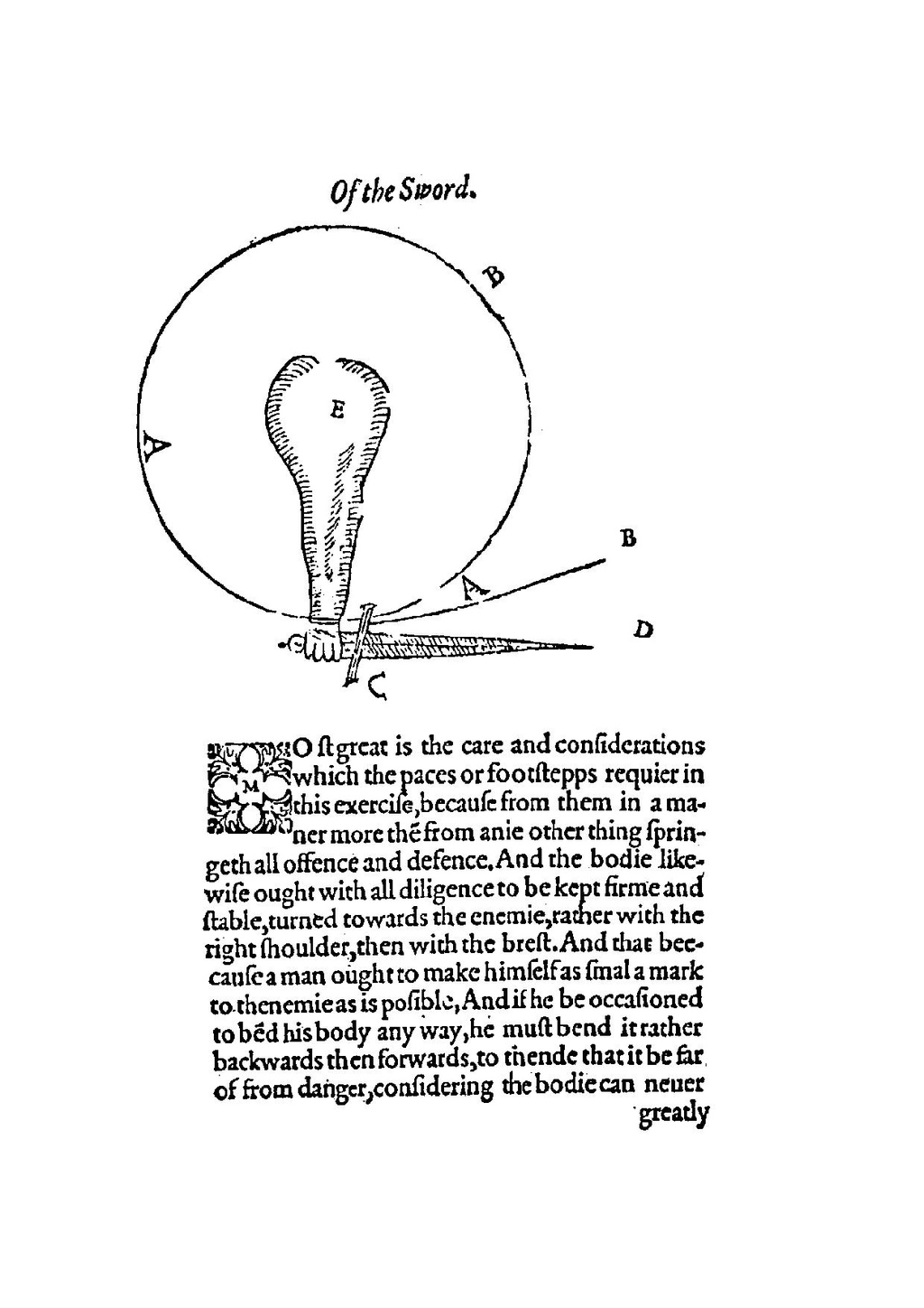 MOst great is the care and considerations which the paces or footstepps requier in this exercise, because from them in a maner more thē from anie other thing springeth all offence and defence. And the bodie likewise ought with all diligence to be kept firme and stable, turned towards the enemie, rather with the right shoulder, then with the brest. And that beecause a man ought to make himself as smal a mark to thenemie as is posible, And if he be occasioned to bēd his body any way, he must bend it rather backwards then forwards, to thende that it be far of from danger, considering the bodie can neuer