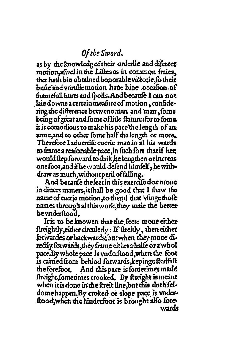 as by the knowledg of their orderlie and discreet motion, aswel in the Listes as in common fraies, ther hath bin obtained honorable victorie, so their busie and vnrulie motion haue bine occasion of shamefull hurts and spoils. And because I can not laie downe a certein measure of motion, considering the difference betwene man and man, some being of great and some oflitle stature: for to some it is comodious to make his pace the length of an arme, and to other some half the length or more. Therefore I aduertise euerie man in al his wards to frame a reasonable pace, in such sort that if hee would step forward to strik, he lengthen or increas one foot, and if he would defend himself, he withdraw as much, without peril offalling.
