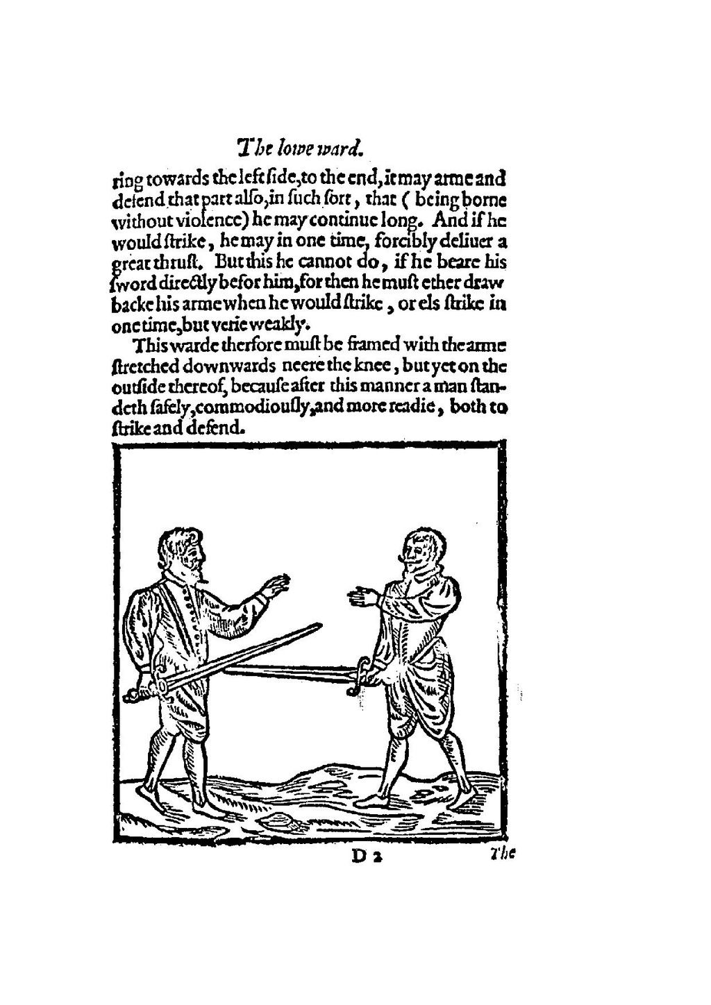 This warde therfore must be framed with the arme stretched downwards neere the knee, but yet on the outside thereof, because after this manner a man standeth safely, commodiously, and more readie, both to strike and defend.