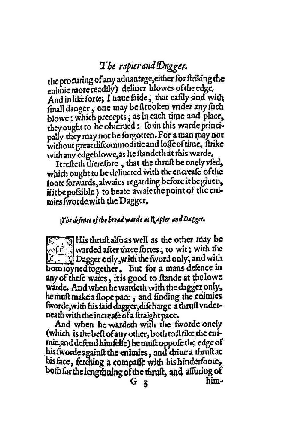 the procuring of any aduantage, either for striking the enimie more readily) deliuer blowes of the edge. And in like sorte, I haue saide, that easily and with small danger, one may be strooken vnder any such blowe: which precepts, as in each time and place, they ought to be obserued: so in this warde principally they may not be forgotten. For a man may not without great discommoditie and losse of time, strike with any edgeblowe, as he standeth at this warde.