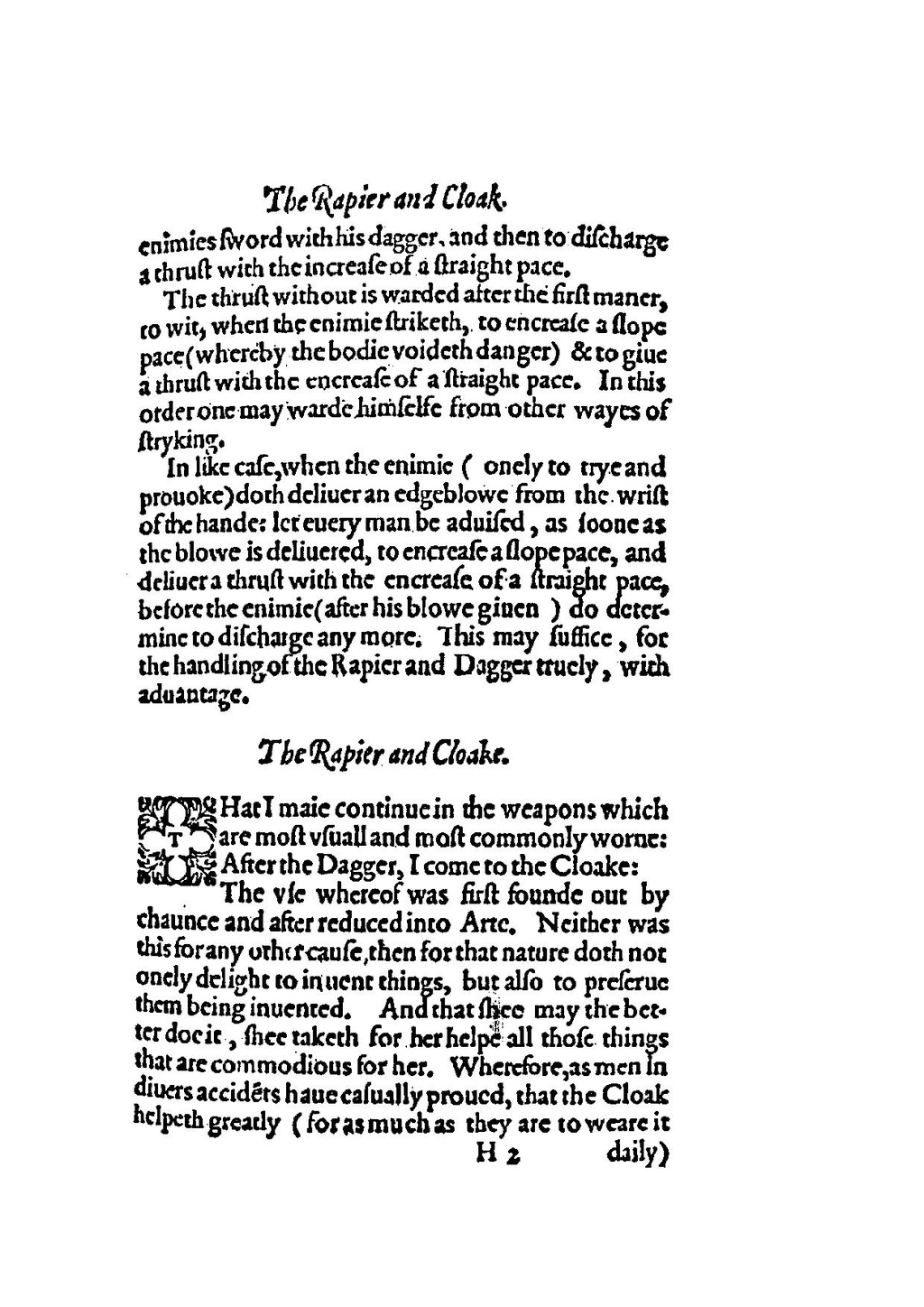 THat I maie continue in the weapons which are most vsuall and most commonly worne: After the Dagger, I come to the Cloake: The vse whereof was first founde out by chaunce, and after reduced into Arte. Neither was this for any other cause, then for that nature doth not onely delight to inuent things, but also to preserue them being inuented. And that shee may the better doe it, shee taketh for her helpe all those things that are commodious for her. Wherefore, as men in diuers accidēts haue casually proued, that the Cloak helpeth greatly (for as much as they are to weare it