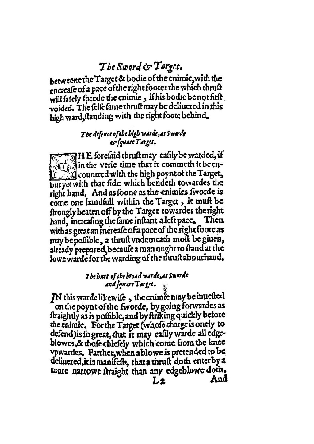 betweene the Target & bodie of the enimie, with the encrease of a pace of the right foote: the which thrust will safely speede the enimie, if his bodie be not fitst voided. The selfe same thrust may be deliuered in this high ward, standing with the right foote behind.