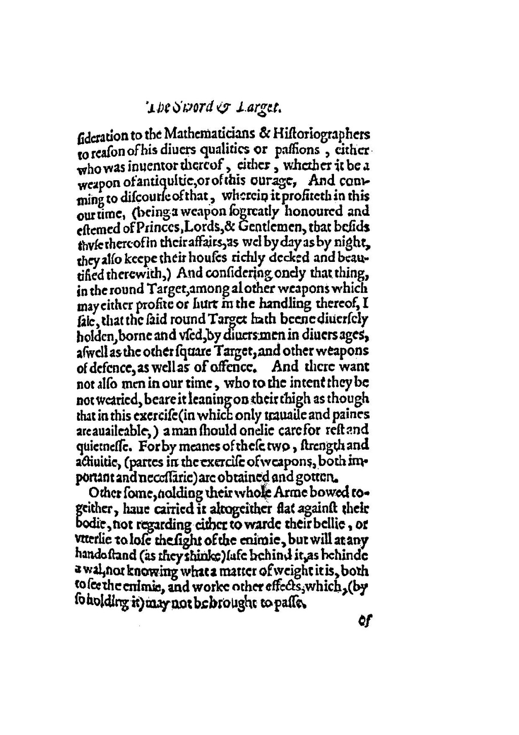 sideration to the Mathematicians & Historiographers to reason of his diuers qualities or passions, either who was inuentor thereof, either, whether it be a weapon of antiquitie, or of this our age, And comming to discourse of that, wherein it profiteth in this our time, (being a weapon sogreatly honoured and estemed of Princes, Lords, & Gentlemen, that besids thvse thereof in their affairs, as wel by day as by night, they also keepe their houses richly decked and beautified therewith,) And considering onely that thing, in the round Target, among al other weapons which may either profite or hurt in the handling thereof, I said, that the said round Target hath beene diuersely holden, borne and vsed, by diuers men in diuers ages, aswell as the other square Target, and other weapons of defence, as well as of offence. And there want not also men in our time, who to the intent they be not wearied, beare it leaning on their thigh as though that in this exercise (in which only trauaile and paines are auaileable,) a man should onelie care for rest and quietnesse. For by meanes of these two, strength and actiuitie, (partes in the exercise of weapons, both important and necessarie) are obtained and gotten.