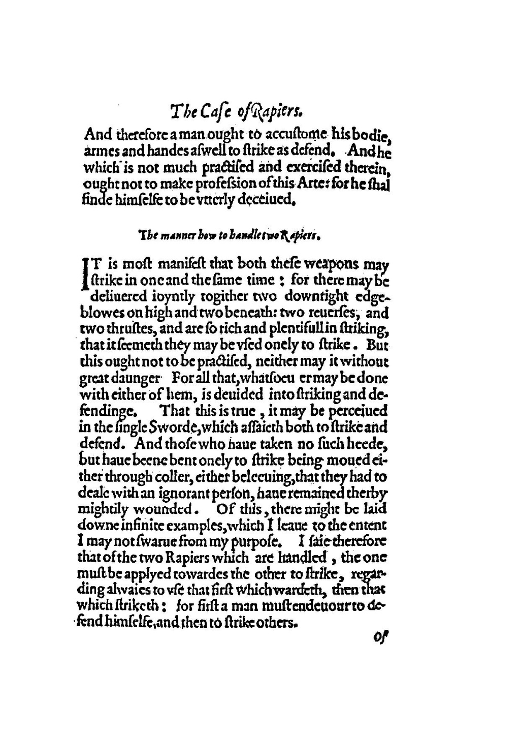 IT is most manifest that both these weapons may strike in one and the same time: for there may be deliuered ioyntly togither two downright edgeblowes on high and two beneath: two reuerses, and two thrustes, and are so rich and plentifull in striking, that it seemeth they may be vsed onely to strike. But this ought not to be practised, neither may it without great daunger For all that, whatsoeu er may be done with either of them, is deuided into striking and defendinge. That this is true, it may be perceiued in the single Sworde, which assaieth both to strike and defend. And those who haue taken no such heede, but haue beene bent onely to strike being moued either through coller, either beleeuing, that they had to deale with an ignorant person, haue remained therby mightily wounded. Of this, there might be laid downe infinite examples, which I leaue to the entent I may not swarue from my purpose. I saie therefore that of the two Rapiers which are handled, the one must be applyed towardes the other to strike, regarding alwaies to vse that first which wardeth, then that which striketh: for first a man must endeuour to defend himselfe, and then to strike others.
