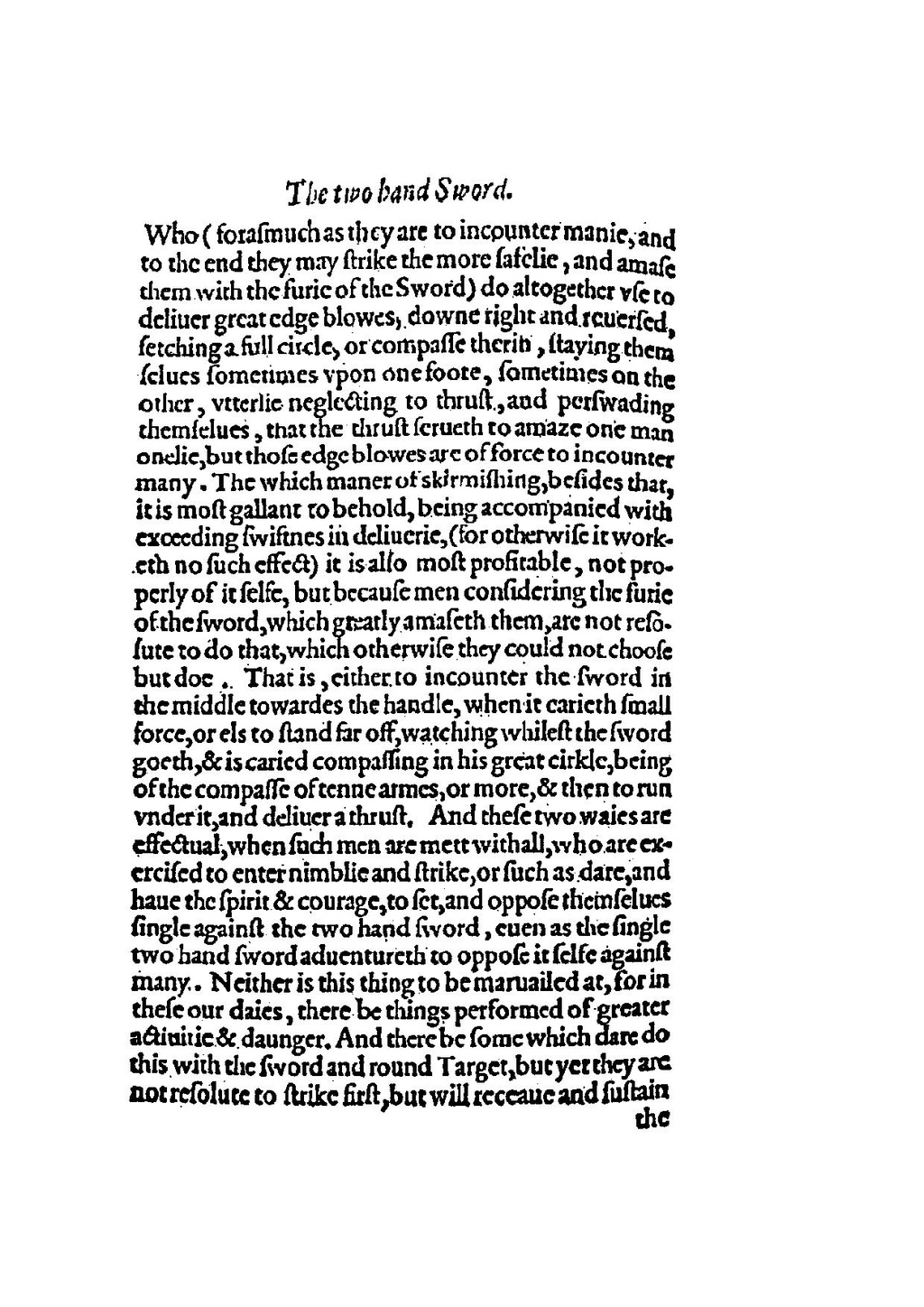Who (forasmuch as they are to incounter manie, and to the end they may strike the more safelie, and amase them with the furie of the Sword) do altogether vse to deliuer great edge blowes, downe right and reuersed, fetching a full circle, or compasse therin, staying them selues sometimes vpon one foote, sometimes on the other, vtterlie neglecting to thrust, and perswading themselues, that the thrust serueth to amaze one man onelie, but those edge blowes are of force to incounter many. The which maner of skirmishing, besides that, it is most gallant to behold, being accompanied with exceeding swiftnes in deliuerie, (for otherwise it worketh no such effect) it is also most profitable, not properly of it selfe, but because men considering the furie of the sword, which greatly amaseth them, are not resolute to do that, which otherwise they could not choose but doe. That is, either to incounter the sword in the middle towardes the handle, when it carieth small force, or els to stand far off, watching whilest the sword goeth, & is caried compassing in his great cirkle, being of the compasse of tenne armes, or more, & then to run vnder it, and deliuer a thrust. And these two waies are effectual, when such men are mett withall, who are exercised to enter nimblie and strike, or such as dare, and haue the spirit & courage, to set, and oppose themselues single against the two hand sword, euen as the single two hand sword aduentureth to oppose it selfe against many. Neither is this thing to be maruailed at, for in these our daies, there be things performed of greater actiuitie & daunger. And there be some which dare do this with the sword and round Target, but yet they are not resolute to strike first, but will receaue and sustain