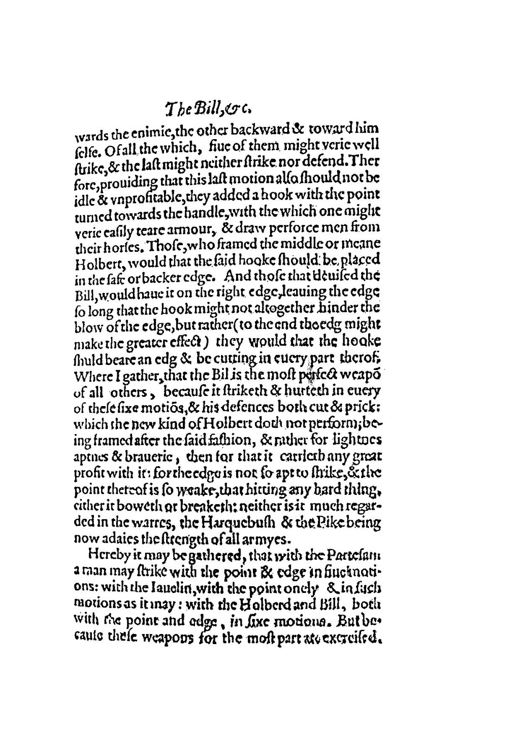 wards the enimie, the other backward & toward him selfe. Of all the which, fiue of them might verie well strike, & the last might neither strike nor defend. Ther fore, prouiding that this last motion also should not be idle & vnprofitable, they added a hook with the point turned towards the handle, with the which one might verie easily teare armour, & draw perforce men from their horses. Those, who framed the middle or meane Holbert, would that the said hooke should be placed in the safe or backer edge. And those that deuised the Bill, would haue it on the right edge, leauing the edge so long that the hook might not altogether hinder the blow of the edge, but rather (to the end the edg might make the greater effect) they would that the hooke shuld beare an edg & be cutting in euery part therof. Where I gather, that the Bil is the most perfect weapō of all others, because it striketh & hurteth in euery of these sixe motiōs, & his defences both cut & prick: which the new kind of Holbert doth not perform, being framed after the said fashion, & rather for lightnes aptnes & brauerie, then for that it carrieth any great profit with it: for the edge is not so apt to strike, & the point thereof is so weake, that hitting any hard thing, either it boweth or breaketh: neither is it much regarded in the warres, the Harquebush & the Pike being now adaies the strength of all armyes.