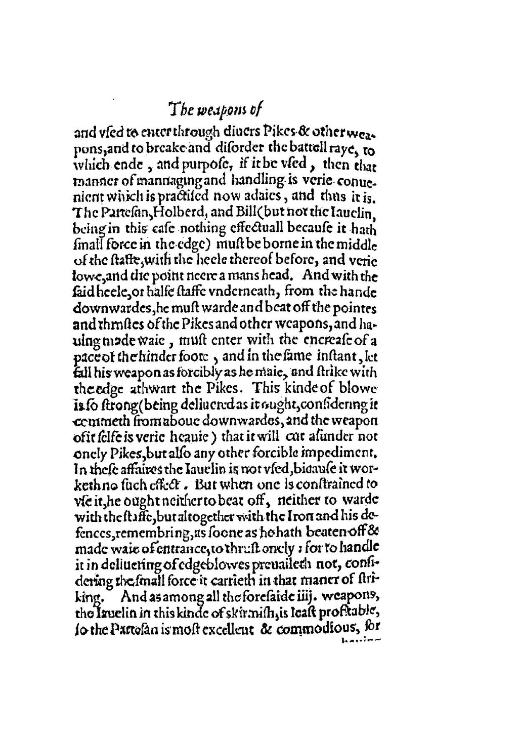 and vsed to enter through diuers Pikes & other weapons, and to breake and disorder the battell raye, to which ende, and purpose, if it be vsed, then that manner of mannaging and handling is verie conuenient which is practised now adaies, and thus it is: The Partesan, Holberd, and Bill (but not the Iauelin, being in this case nothing effectuall because it hath small force in the edge) must be borne in the middle of the staffe, with the heele thereof before, and verie lowe, and the point neere a mans head. And with the said heele, or halfe staffe vnderneath, from the hande downwardes, he must warde and beat off the pointes and thrustes of the Pikes and other weapons, and hauing made waie, must enter with the encrease of a pace of the hinder foote, and in the same instant, let fall his weapon as forcibly as he maie, and strike with the edge athwart the Pikes. This kinde of blowe is so strong (being deliuered as it ought, considering it commeth from aboue downwardes, and the weapon of it selfe is verie heauie) that it will cut asunder not onely Pikes, but also any other forcible impediment. In these affaires the Iauelin is not vsed, bicause it worketh no such effect. But when one is constrained to vse it, he ought neither to beat off, neither to warde with the staffe, but altogether with the Iron and his defences, remembring, as soone as he hath beaten off & made waie of entrance, to thrust onely: for to handle it in deliuering of edgeblowes preuaileth not, considering the small force it carrieth in that maner of striking. And as among all the foresaide iiij. weapons, the Iauelin in this kinde of skirmish, is least profitable, so the Partesan is most excellent & commodious, for