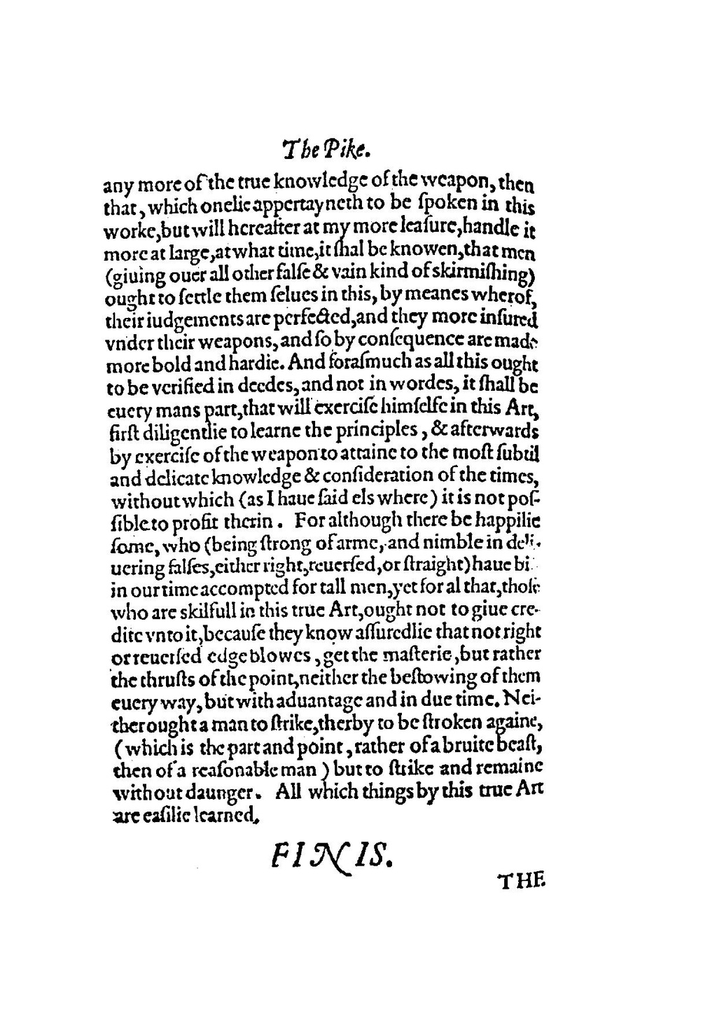 any more of the true knowledge of the weapon, then that, which onelie appertayneth to be spoken in this worke, but will hereafter at my more leasure, handle it more at large, at what time, it shal be knowen, that men (giuing ouer all other false & vain kind of skirmishing) ought to settle them selues in this, by meanes wherof, their iudgements are perfected, and they more insured vnder their weapons, and so by consequence are made more bold and hardie. And forasmuch as all this ought to be verified in deedes, and not in wordes, it shall be euery mans part, that will exercise himselfe in this Art, first diligentlie to learne the principles, & afterwards by exercise of the weapon to attaine to the most subtil and delicate knowledge & consideration of the times, without which (as I haue said els where) it is not possible to profit therin. For although there be happilie some, who (being strong of arme, and nimble in deliuering falses, either right, reuersed, or straight) haue bin in our time accompted for tall men, yet for al that, those who are skilfull in this true Art, ought not to giue credite vnto it, because they know assuredlie that not right or reuersed edge blowes, get the masterie, but rather the thrusts of the point, neither the bestowing of them euery way, but with aduantage and in due time. Neither ought a man to strike, therby to be stroken againe, (which is the part and point, rather of a bruite beast, then of a reasonable man) but to strime and remaine without daunger. All which things by this true Art are easilie learned.