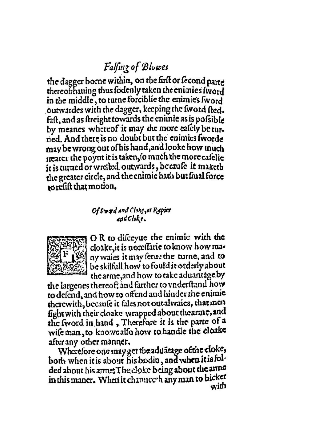 FOR to disceyue the enimie with the cloake, it is necessarie to know how many waies it may serue the turne, and to be skilfull how to fould it orderly about the arme, and how to take aduantage by the largenes thereof: and farther to vnderstand how to defend, and how to offend and hinder the enimie therewith, because it fales not out alwaies, that men fight with their cloake wrapped about the arme, and the sword in hand, Therefore it is the parte of a wise man, to knowe also how to handle the cloake after any other manner.