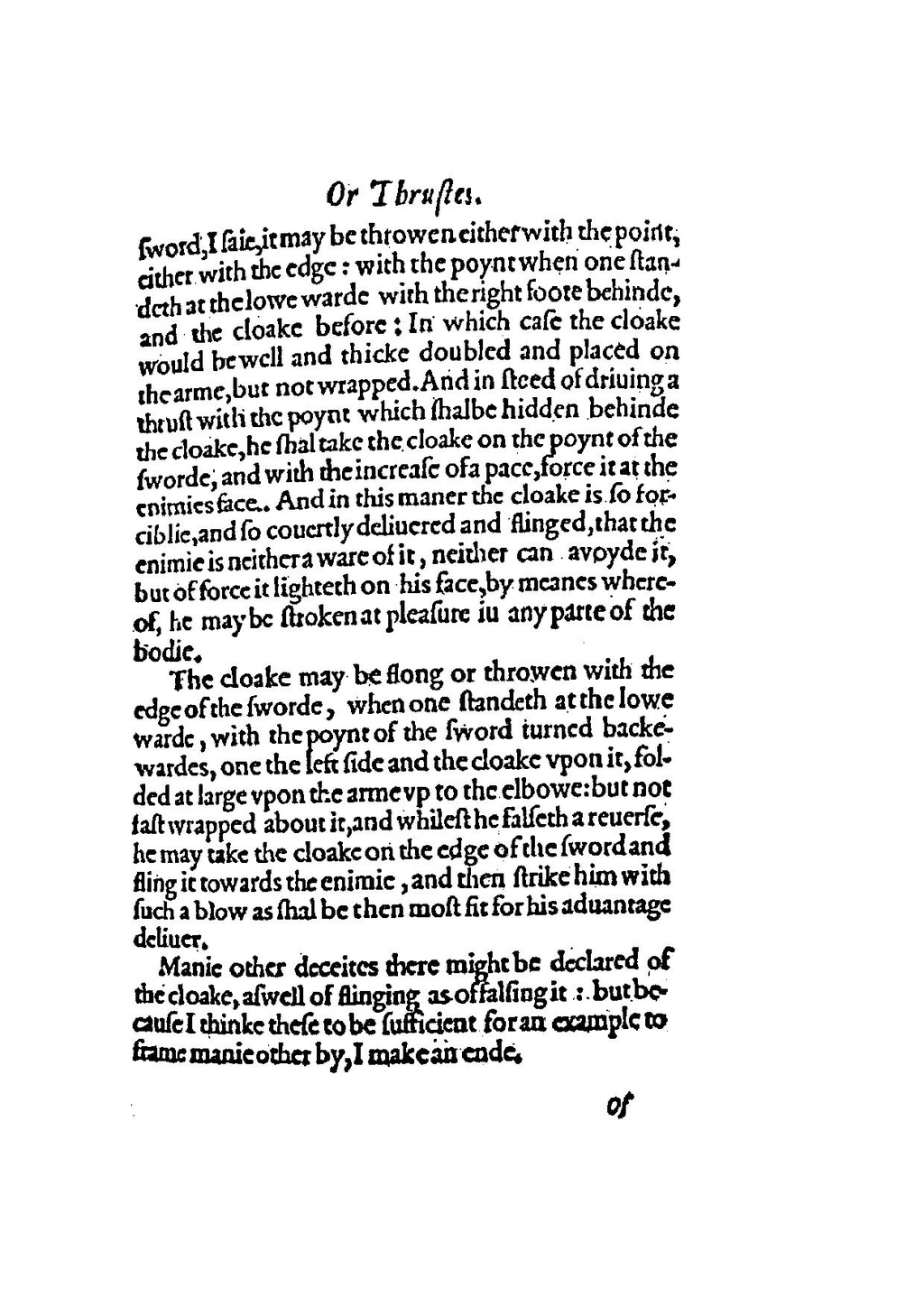 sword, I saie, it may be throwen either with the point, either with the edge: with the poynt when one standeth at the lowe warde with the right foote behinde, and the cloake before: In which case the cloake would be well and thicke doubled and placed on the arme, but not wrapped. And in steed of driuing a thrust with the poynt which shalbe hidden behinde the cloake, he shal take the cloake on the poynt of the sworde, and with the increase of a pace, force it at the enimies face. And in this maner the cloake is so forcib lie, and so couertly deliuered and flinged, that the enimie is neither a ware of it, neither can avoyde it, but of force it lighteth on his face, by meanes whereof, he may be stroken at pleasure in any parte of the bodie.