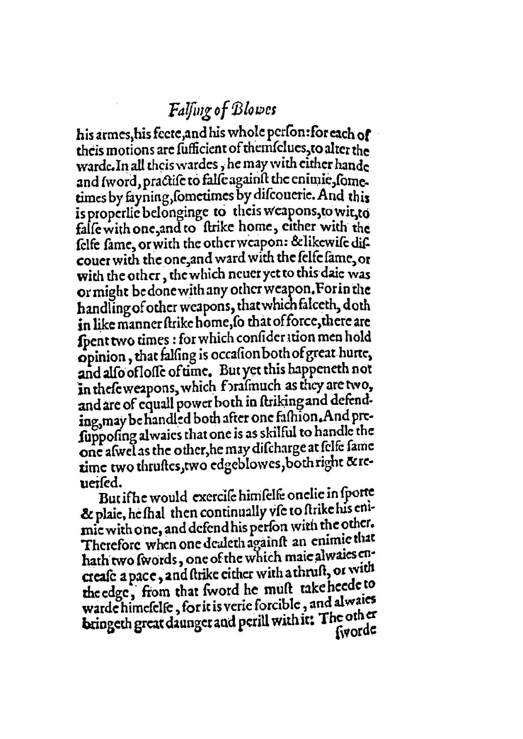 his armes, his feete, and his whole person: for each of theis motions are sufficient of themselues, to alter the warde. In all theis wardes, he may with either hande and sword, practise to false against the enimie, sometimes by fayning, sometimes by discouerie. And this is properlie belonginge to theis weapons, to wit, to false with one, and to strike home, either with the selfe same, or with the other weapon: & likewise discouer with the one, and ward with the selfe same, or with the other, the which neuer yet to this daie was or might be done with any other weapon. For in the handling of other weapons, that which falceth, doth in like manner strike home, so that of force, there are spent two times: for which consideration men hold opinion, that falsing is occasion both of great hurte, and also of losse of time. But yet this happeneth not in these weapons, which forasmuch as they are two, and are of equall power both in striking and defending, may be handled both after one fashion. And presupposing alwaies that one is as skilful to handle the one aswelas the other, he may discharge at selfe same time two thrustes, two edgeblowes, both right & reuersed.