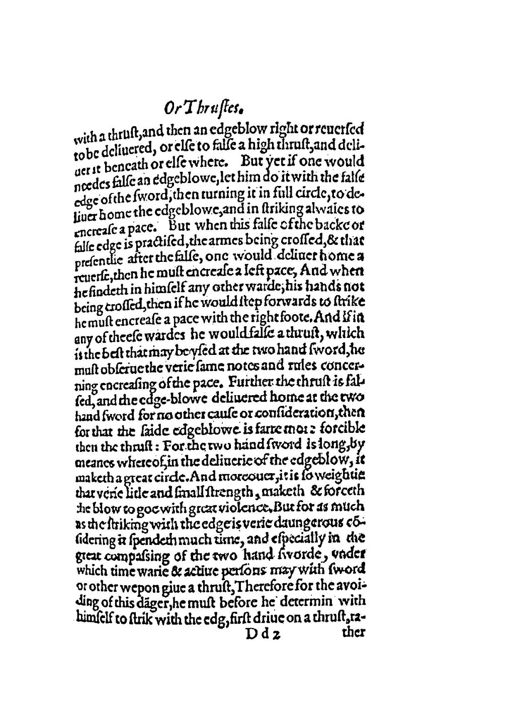 with a thrust, and then an edgeblow right or reuersed to be deliuered, or else to false a high thrust, and deliuer it beneath or else where. But yet if one would needes false an edgeblowe, let him do it with the false edge of the sword, then turning it in full circle, to deliuer home the edgeblowe, and in striking alwaies to encrease a pace. But when this false of the backe or false edge is practised, the armes being crossed, & that presentlie after the false, one would deliuer home a reuerse, then he must encrease a left pace, And when he findeth in himself any other warde, his hands not being crossed, then if he would step forwards to strike he must encrease a pace with the right foote. And if in any of theese wardes he would false a thrust, which is the best that may be vsed at the two hand sword, he must obserue the verie same notes and rules concerning encreasing of the pace. Further the thrust is falsed, and the edge-blowe deliuered home at the two hand sword for no other cause or consideration, then for that the saide edgeblowe is farre more forcible then the thrust: For the two hand sword is long, by meanes whereof, in the deliuerie of the edgeblow, it maketh a great circle. And moreouer, it is so weightie that verie litle and small strength, maketh & forceth the blow to goe with great violence. But for as much as the striking with the edge is verie daungerous cōsidering it spendeth much time, and especially in the great compassing of the two hand sworde, vnder which time warie & actiue persons may with sword or other wepon giue a thrust, Therefore for the avoiding of this dāger, he must before he determin with himself to strik with the edg, first driue on a thrust, rather