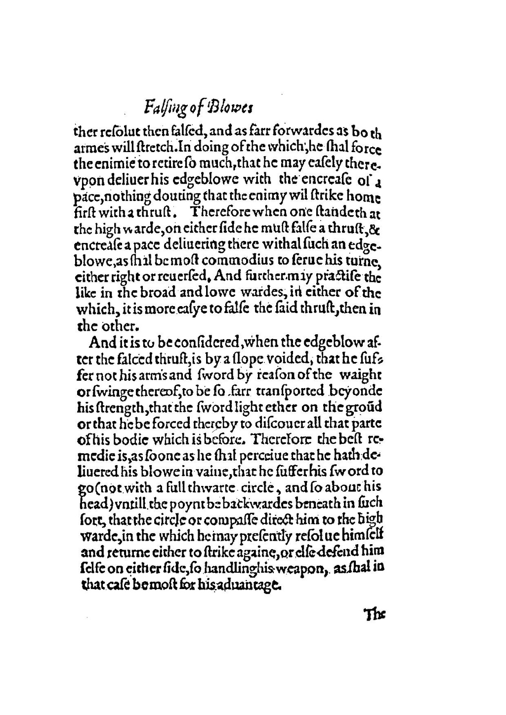 And it is to be considered, when the edgeblow after the falced thrust, is by a slope voided, that he suffer not his arms and sword by reason of the waight or swinge thereof, to be so farr transported beyonde his strength, that the sword light ether on the groūd or that he be forced thereby to discouer all that parte of his bodie which is before. Therefore the best remedie is, as soone as he shal perceiue that he hath deliuered his blowe in vaine, that he suffer his sword to go (not with a full thwarte circle, and so about his head) vntill the poynt be backwardes beneath in such sort, that the circle or compasse direct him to the high warde, in the which he may presently resolue himself and returne either to strike againe, or else defend him selfe on either side, so handlinghis weapon, as shal in that case be most for his aduantage.