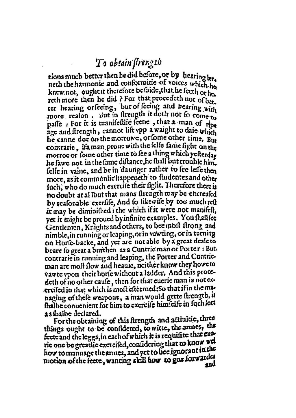 For the obtaining of this strength and actiuitie, three things ought to be considered, to witte, the armes, the feete and the leggs, in each of which it is requisite that euerie one be greatlie exercised, considering that to know wel how to mannage the armes, and yet to bee ignorant in the motion of the feete, wanting skill how to goe forwardes
