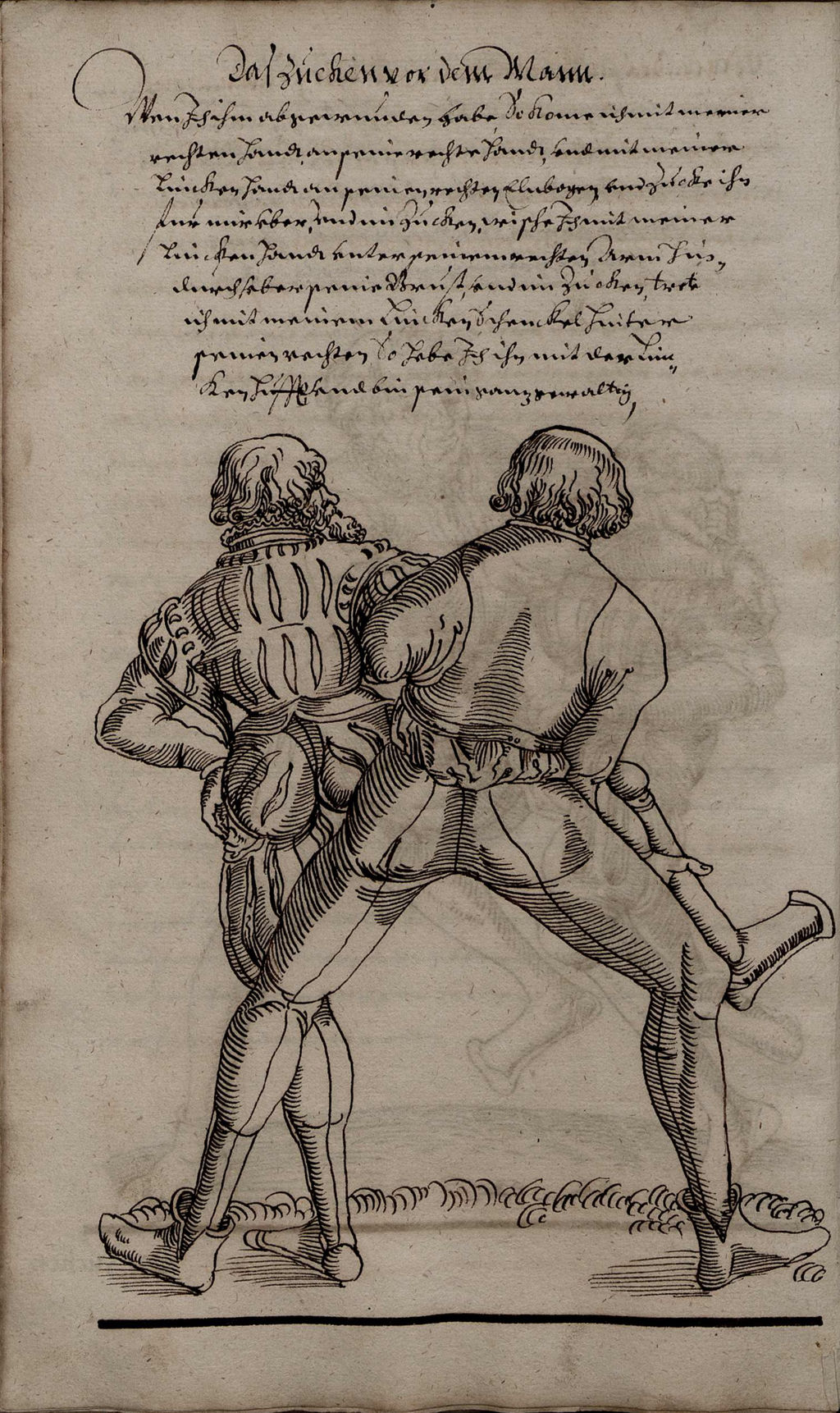 Wen ich ihm abgewunden habe, so kome ich mit meiner rechten hand, an seine rechte hand, vnd mit meiner lincken hand an seinen rechten elnbogen vnd zucke ihn fur mir vber, vnd im zucken, wische ich mit meiner lincken hand vnder seinem rechten arm hindurch vber seine brust, vnd im zucken trete ich mit meinem lincken schenckel hinter seinen rechten, so hebe ich ihn mit der lincken huffte vnd bin sein ganz gewaltig.