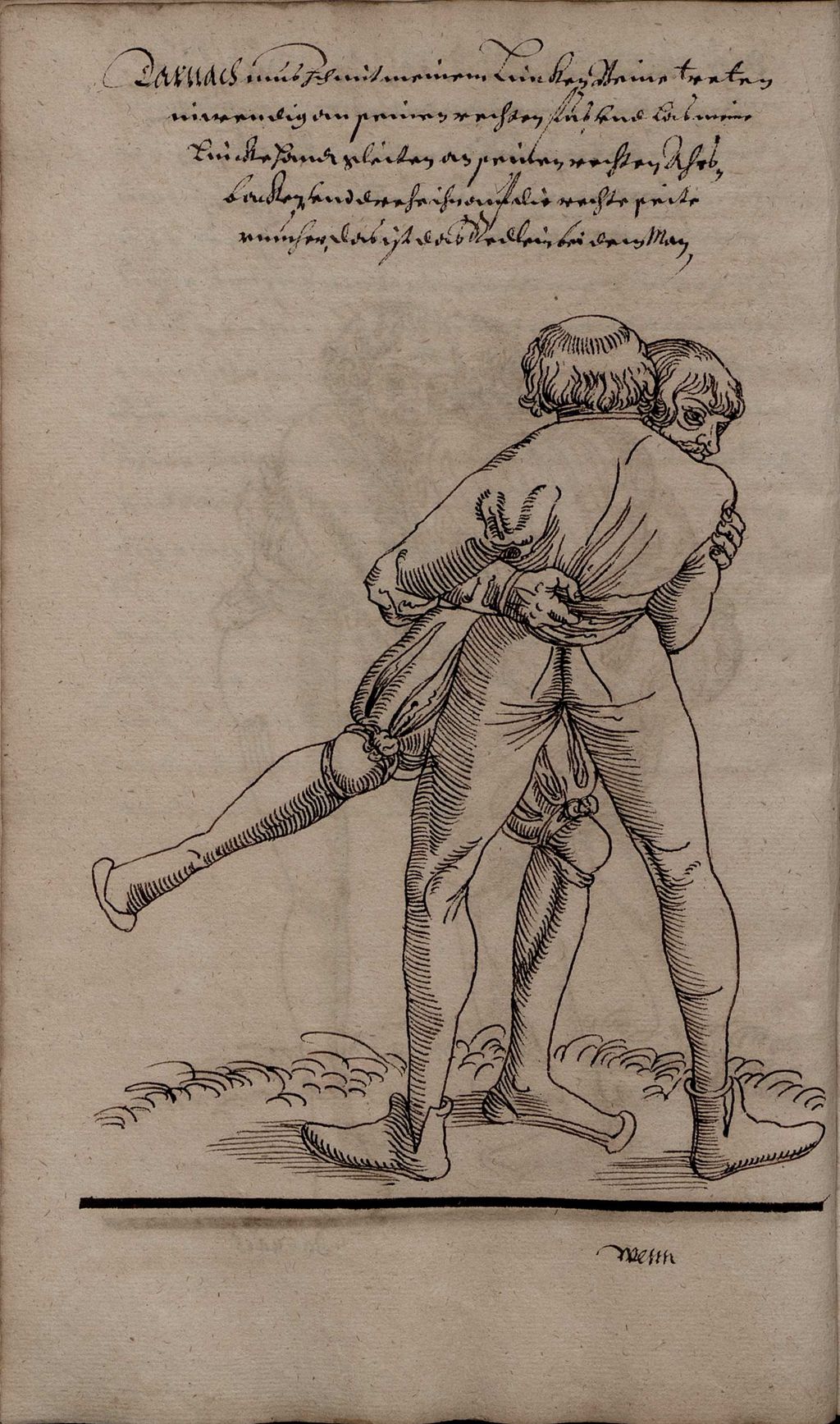 Darnach mus ich mit meinem lincken beinen treten inwendig an seinen rechten fus vnd las meine lincke hand gleiden an seinen rechten ahrsbacken vnd drehe die rechte seite rumher, das ist das redlein bei dem man.