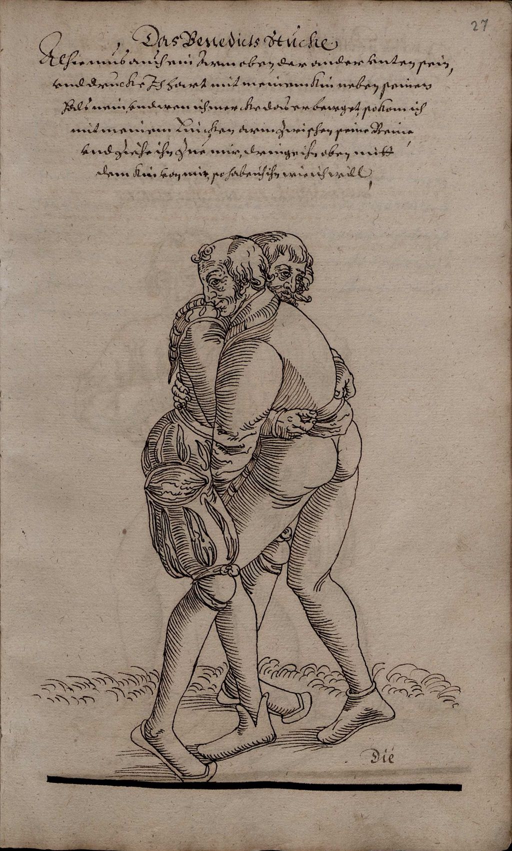 Also mus auch ein arm oben, der ander vnten sein, vnd drucke ich hart mit meinem kin neben seinen hals nein, vnd wen ich mercke das er bewget, so kom ich mit meinem lincken arm zwischen seine beine, vnd ziehe ihn zue mir, dringe ihn oben mitt dem kin von mir, so habe ich ihn wie ich will.