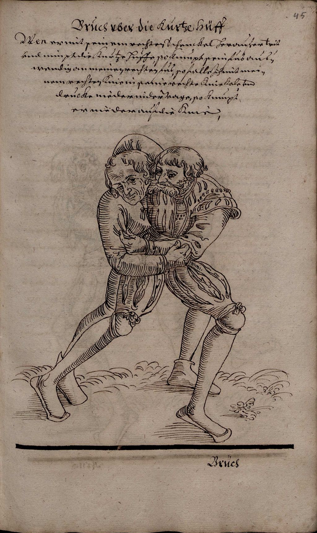 Wen er mit seinem rechten schenckel heraußer trit vnd nimpt die kurtze huffe, so kumpt sein fus auswendig an meinen rechten fus, so falle ich mit meinem rechten knie in seine rechte kniekele vnd drucke nieder in der wage, so kumpt er nieder auf die knie.