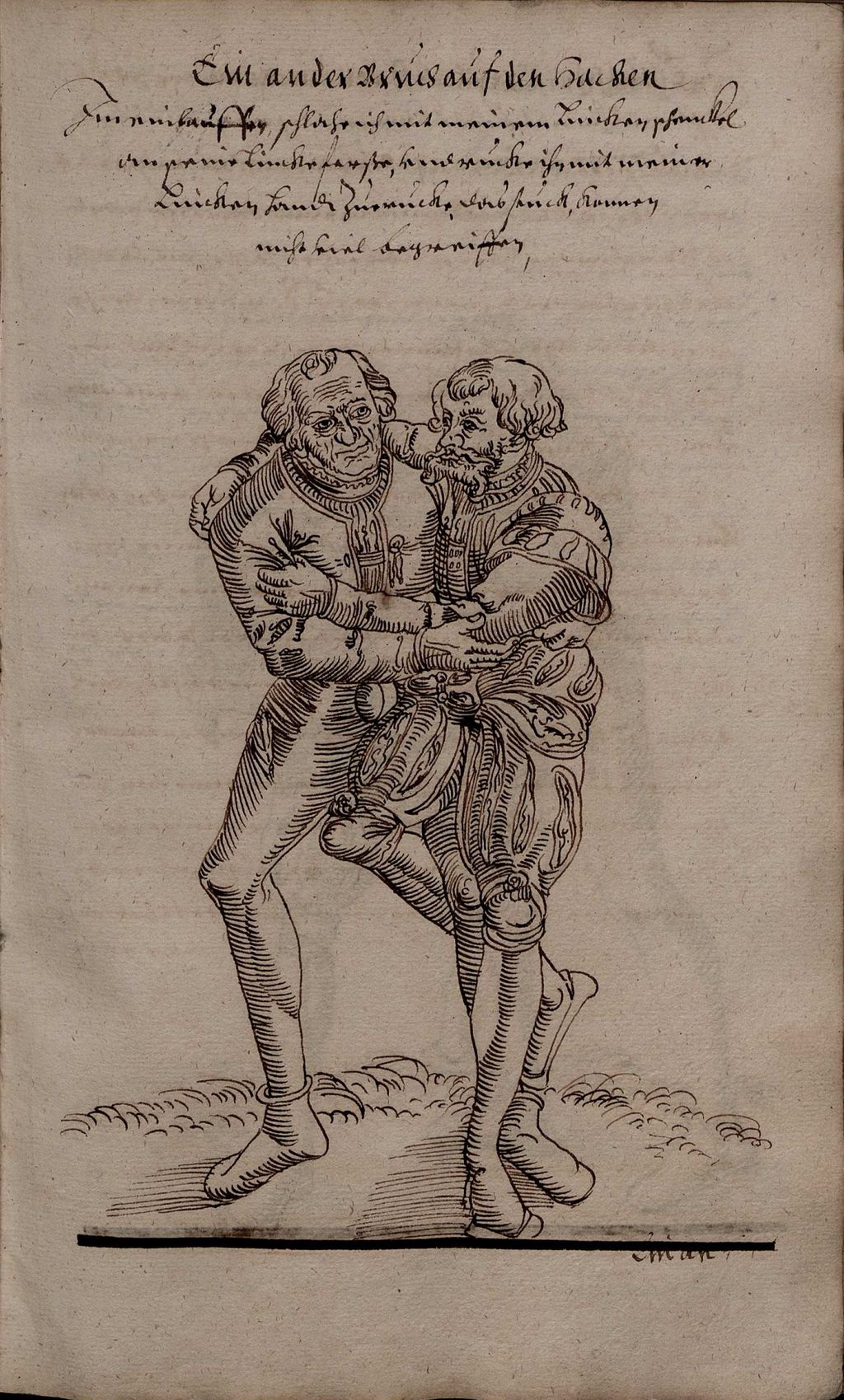 Im einlauffen schlache ich mit meinem lincken schenckel an seine lincke ferße, vnd rucke ihn mit meiner lincken hand zuerucke, das stuck konnen nicht viel begreiffen.