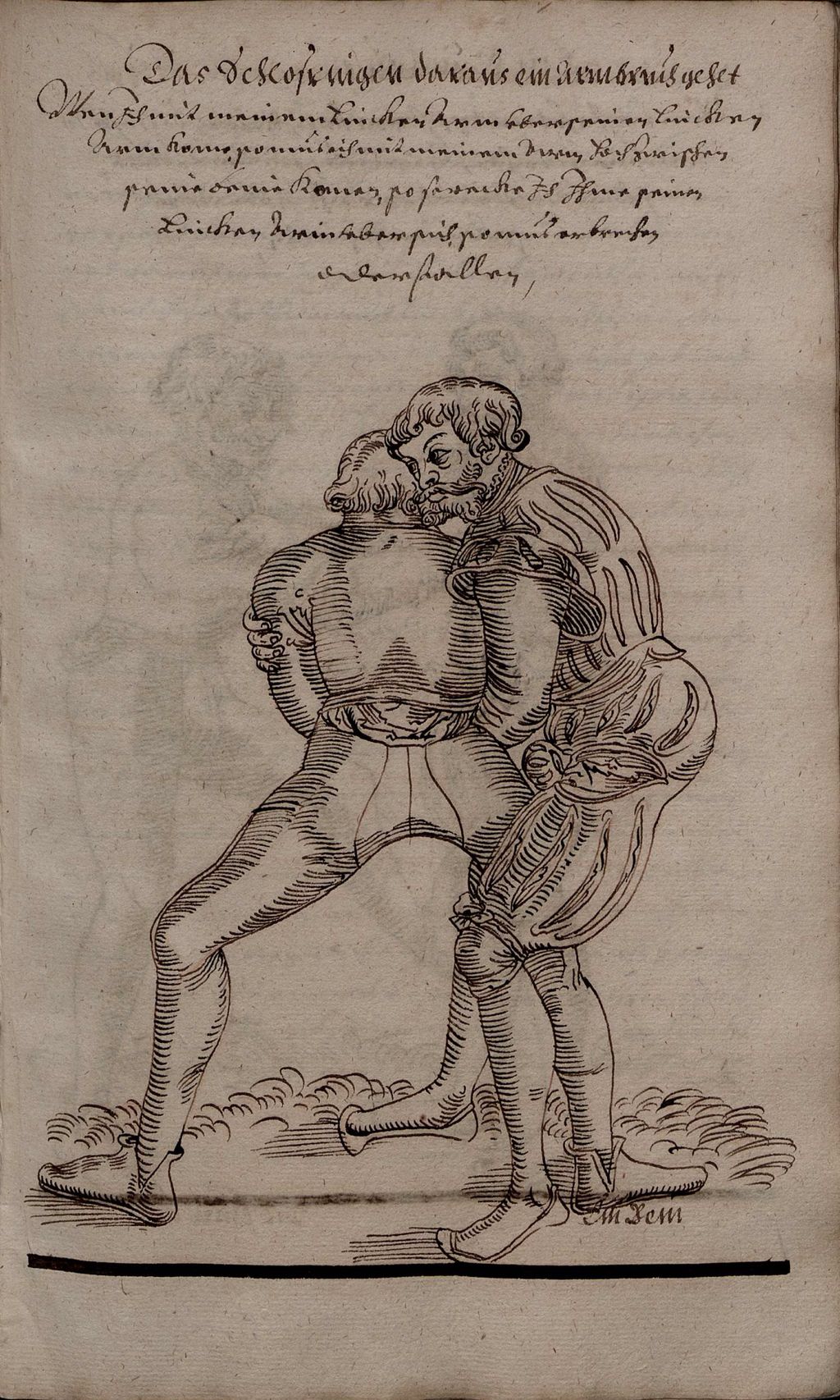 Wen ich mit meinem lincken arm vber seinen lincken arm kome, so mus ich mit meinem arm hoch zwischen seine beine komen, so strecke ich ihme seinen lincken arm vber sich, so mus er brechen oder fallen.