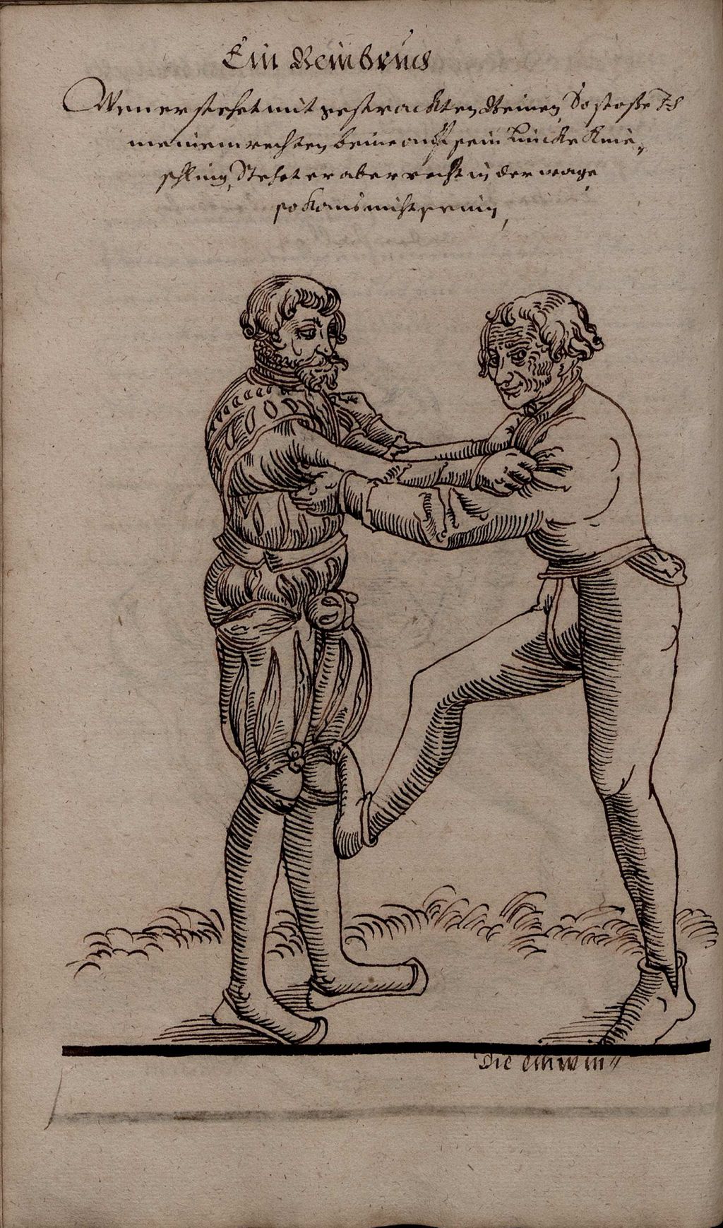 Wen er stehet mit gestreckten beinen, so stoße ich meinem rechten beine auf sein lincke knie, schling, stehet er aber recht in der wage so kans nicht seinn.