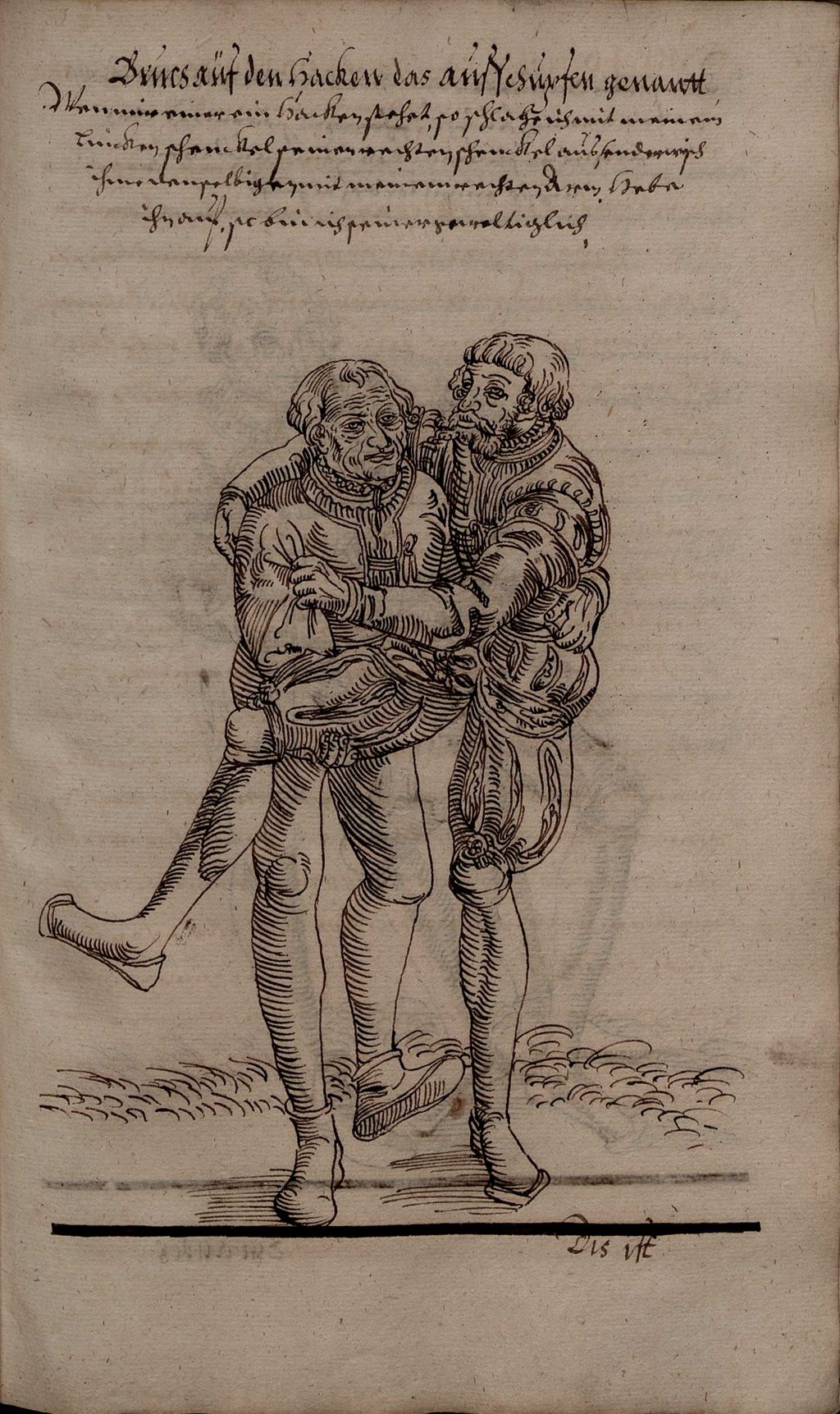Wen mir einer ein hacken stehet, so schlage ich mit meinem lincken schenckel seinen rechten schenckel aus, vnd erwisch ihme denselbigen mit meinem rechten arm. Hebe ihn auf. so bin ich seiner gewaltiglich.