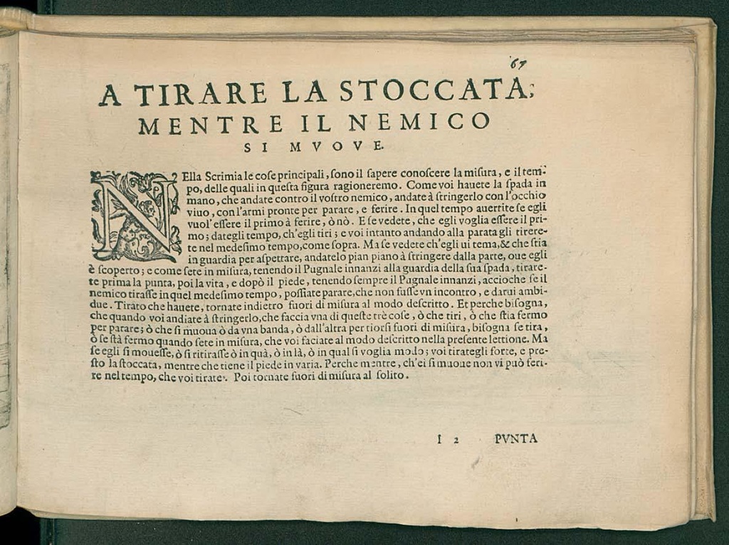 Revision as of 19:13, 12 July 2020 by Michael Chidester (talk | contribs) (→‎Not proofread: Created page with "'''A TIRARE LA STOCCATA, MENTRE IL NEMICO''' SI MUOVE. '''N'''Ella Scrimia le cose principali, sono il sapere conoscere la misura, e il tempo, delle quali in questa figura ra...")