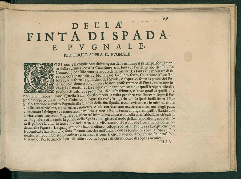 Revision as of 19:18, 12 July 2020 by Michael Chidester (talk | contribs) (→‎Not proofread: Created page with "'''DELLA FINTA DI SPADA, E PUGNALE,''' PER FERIRE SOPRA IL PUGNALE. '''C'''OSI come la cognitione del tempo, e della misura è il principal fondamento della Scrimia, così la...")