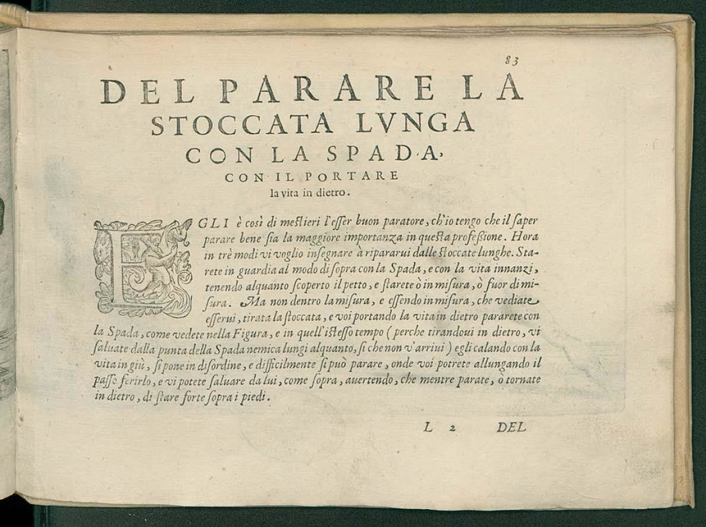 EGLI è così di mestieri l’esser buon paratore, ch’io tengo che il saper parare bene sia la maggiore importanza in questa professione. Hora in trè modi vi voglio insegnare à ripararvi dalle stoccate lunghe. Starete in guardia al modo di sopra con la Spada, e con la vita innanzi, tenendo alquanto scoperto il petto, e starete ò in misura, ò fuor di misura. Ma non dentro la misura, e essendo in misura, che vediate esservi, tirata la stoccata, e voi portando la vita in dietro pararete con la Spada, come vedete nella Figura, e in quell’istesso tempo (perche tirandovi in dietero, vi salvate dalla punta della Spada nemica lungi alquanto, si che non v’arrivi) egli calando con la vita in giù, si pone in disordine, e difficilmente si può parare, onde voi potrete allungando il passo ferirlo, e vi potete salvare da lui, come sopra, avertendo, che mentre parate, ò tornate in dietro, di stare forte sopra i piedi.