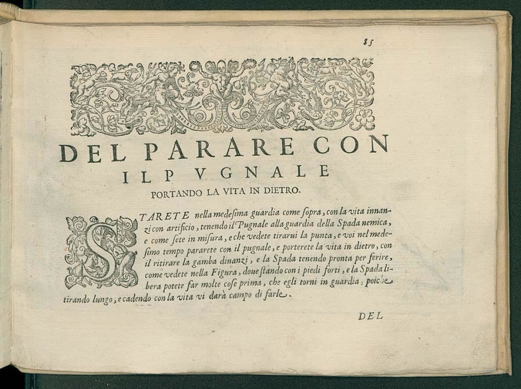 STARATE nella medesima guardia come sopra, con la vita innanzi con artificio, tenendo il Pugnale alla guardia della Spada nemico, e come sete in misura, e che vedete tirarvi la punta, e voi nel medesimo tempo pararete con il pugnale, e porterete la vita in dietro, con il ritirare la gamba dinanzi, e la Spada tenendo pronta per ferire, come vedete nella Figura, dove stando con i piedi forti, e la Spada libera potete far molte cose prima, che egli torni in guardia, poiche tirando lungo, e cadendo con la vita vi darà campo di farle.