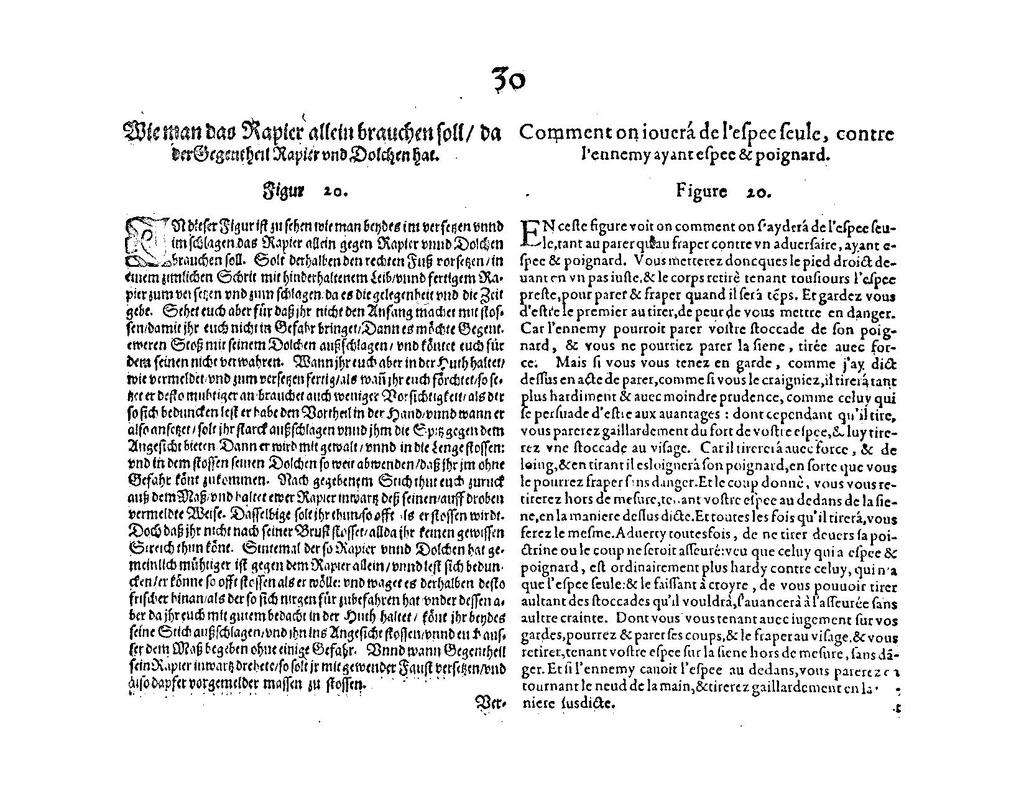 IN dieser Figur ist zu sehen wie man beydes im versetzen vnnd im schlagen das Rapier allein gegen Rapier vnnd Dolch brauchen soll. Solt derhalben den rechten Fuß vorsetzen, in einem zimlichen Schrit mit hinderhaltenem Leib, vnnd fertigem Rapier zum versetzen vnd zum schlagen da es die gelegenheit vnd die Zeit gebe. Sehet euch aber fuͤr daß jhr nicht den Anfang machet mit stossen, damit jhr euch nicht in Gefahr bringet, Dann es moͤchte Gegenth. eweren Stoß mit seinem Dolchen außschlagen, vnd koͤntet euch fuͤr dem seynen nicht verwahren. Wann jhr euch aber in der Huth haltet, wie vermeldet, vnd zum versetzen fertig, als wann jhr euch foͤrchtet, so setzet er desto muhtiger an, brauchet auch weniger Vorsichtigkeit, als der so sich beduncken lest er habe den Vortheil in der Hand, vnnd wann er also ansetzet, solt jhr stark außschlagen vnnd jhm die Spitz gegen dem Angesicht bieten. Dann er wird mit gewalt, vnnd in die Lenge stossen: vnd in dem stossen seinen Dolch so weit abwenden, daß jhr jm ohne Gefahr koͤnt zukommen. Nach gegebenem Stich thut euch zuruck auß dem Maß, vnd haltet ewer Rapier inwartz deß seinen, auff droben vermeldte Weise. Dasselbige solt jhr thun, so offt als er stossen wirdt. Doch das jhr nicht nach seiner Brust stosset, allda jhr keinen gewissen Streich thun koͤnt. Sintemal der so Rapier vnnd Dolch hat gemeinlich muͤhtiger ist gegen dem Rapier allein, vnnd lest sich beduncken, er koͤnne so offt stossen als er woͤlle: vnd waget es derhalben desto frischer hinan, als der so sich nirgen fuͤr zubefahren hat, vnder deßen aber da jhr euch mit gutem bedacht in der Huth haltet, koͤnt jhr beydes seine Stich außschlagen, vnd jhn ins Angesicht stossen, vnnd euch ausser dem Maß begeben ohne einige Gefahr. Vnnd wann Gegentheil seyn Rapier inwartz drehete, so solt jr mit gewender Faust versetzen, vnd also dapfer vorgemelder massen zu stoßen.
