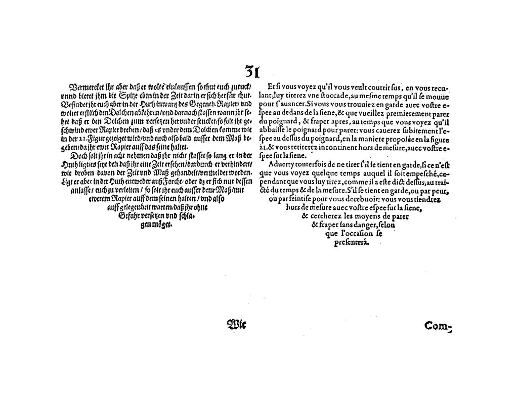 Vermerket jhr aber daß er wolte einlauffen so thut euch zuruck, vnnd bietet jhm die Spitze eben in der Zeit darin er sich herfuͤr thut. Befindet jhr euch aber in der Huth inwartz des Gegenth. Rapier, vnd woltet erstlich den Dolch abkehren, vnd danach stossen wann jhr sehet daß er den Dolchen zum versetzen hervnder senket, so solt jhr geschwind ewer Rapier drehen, daß es vnder dem Dolchen komme wie in der 21. Figur gezeiget wird, vnd euch also bald ausser dem Maß begeben, da jhr ewer Rapier auff das seine haltet.