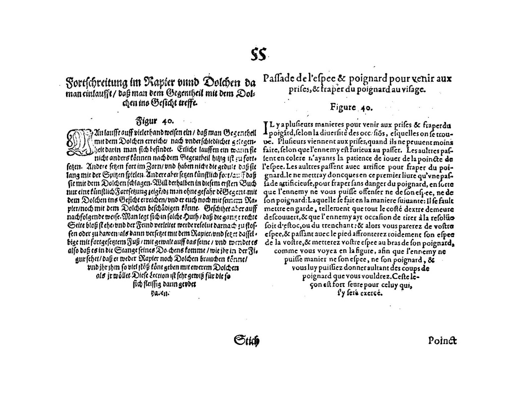 MAn laufft auff vielerhand weisen ein, daß man Gegentheil mit dem Dolchen erreiche, nach vnderschiedlicher gelegenheit darin man sich befindet. Etliche lauffen ein wann sie nicht anders koͤnnen nach dem Gegentheil hitzig ist zu fortsetzen. Andere setzen fort im Zorn, vnd haben nicht die gedult daß sie lang mit der Spitzen spielen. Andere aber setzen kuͤnstlich fort, auff daß sie mit dem Dolchen schlagen. Will derhalben in diesem ersten Buch nur eine kuͤnstliche Fortsetzung zeigen, dz man ohne gefahr den Gegent. mit dem Dolchen ins Gesicht erreichen, vnd er euch noch mit seinem Rapier, noch mit seinem Dolchen beschaͤdigen koͤnne. Geschihet aber auff nachfolgende weise. Man leget sich in solche Huth, daß die gantze rechte Seite bloß stehe, vnd der Feind verleitet werde resolut darnach zu stossen oder zu hawen: als dann versetzet mit dem Rapier, vnd setzet dasselbige mit fortgesetztem Fuß, mit gewalt auff das seine, vnd wendet es also daß es in die Stange seines Dolchens komme, wie jhr in der Figur sehet, daß er weder Rapier noch Dolchen brauchen koͤnne, vnd jhr jhm so viel stoͤß koͤnt geben mit ewerem Dolchen als jr woͤllet. Diese Lection ist sehr gewiß fuͤr die so sich fleissig darin gevbet haben.