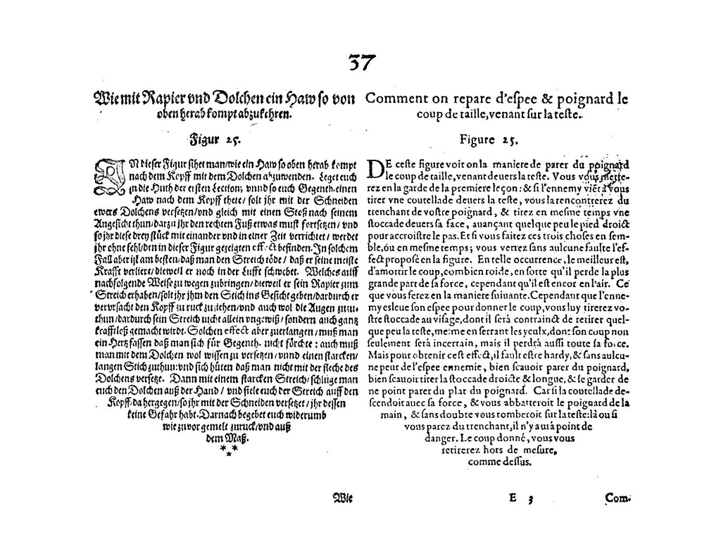 DE cette figure voit-on la manière de parer du poignard le coup de taille venant devers la tête. Vous vous mettrez en la garde de la première leçon, & si l’ennemi vient à vous tirer une coutelade devers la tête, vous la rencontrerez du tranchant de votre poignard & tirerez en même temps une estocade devers la face, avançant quelque peu le pied droit pour accroître le pas. Et si vous faites ces trois choses ensemble, ou en même temps, vous verrez sans aucune faute l’effet proposé en cette figure. En telle occurrence, le meilleur est d’amortir le coup, combien raide, en sorte qu’il perde la plus grande partie de sa force cependant qu’il est encore en l’air. Ce que vous ferez en la manière suivante. Cependant que l’ennemi élève son épée pour donner le coup, vous lui tirerez votre estocade au visage, dont il sera contraint de retirer quelque peu la tête, même en serrant les yeux, dont son coup non seulement sera incertain, mais il perdra aussi toute sa force. Mais pour obtenir cet effet il faut être hardi, & sans aucune peur de l’épée ennemie, bien savoir parer du poignard, bien savoir tirer l’estocade droite & longue, & se garder de ne point parer du plat du poignard. Car si la coutellade descendait avec sa force, & vous abattrait le poignard de la main, & sans doute vous tomberait sur la tête là ou si vous parez du tranchant, il n’y aurait pas de danger. Le coup donné, vous vous retirerez hors de mesure, comme dessus.