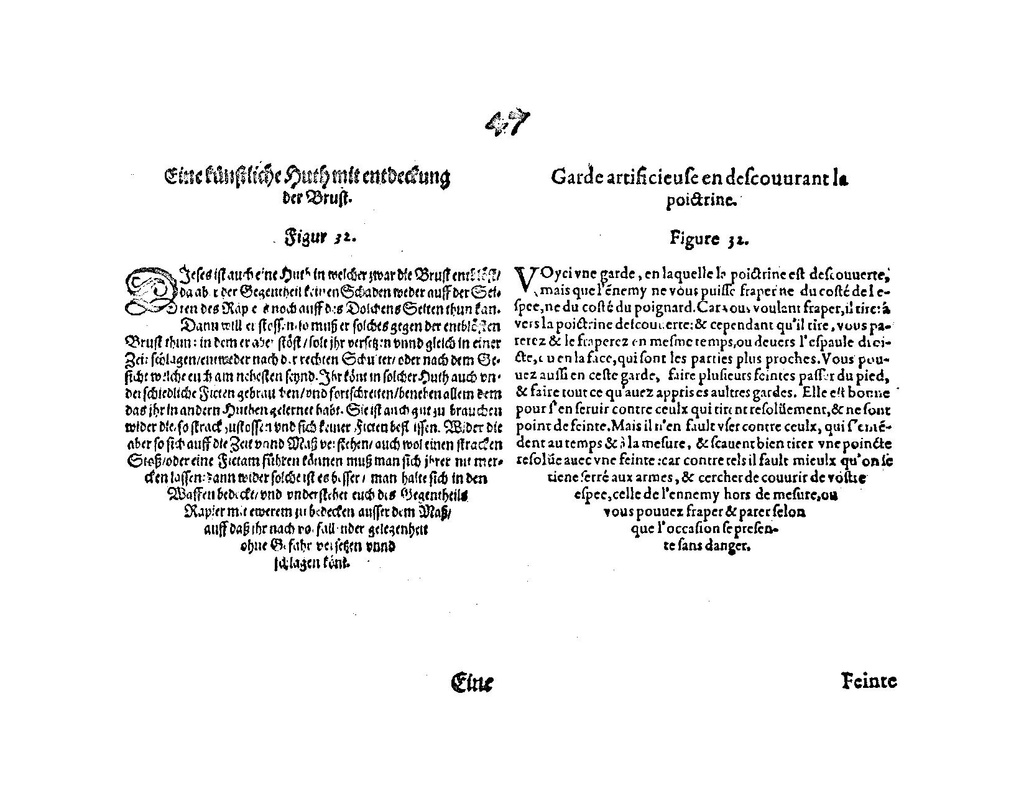 VOici une garde, en laquelle la poitrine est découverte, mais que l’ennemi ne vous puisse frapper ni du côté de l’épée, ni du côté du poignard. Car vous voulant frapper, il tirera vers la poitrine découverte ; & cependant qu’il tire, vous parerez & le frapperez en même temps, ou devers l’épaule droite, ou en la face, qui sont les parties les plus proches. Vous pouvez aussi en cette garde, faire plusieurs gardes passant du pied, & faire tout ce que vous avez appris es autres gardes. Elle est bonne pour s’en servir contre ceux qui tirent résolument, & ne font point de feinte. Mais il n’en faut user contre ceux qui s’entendent au temps & à la mesure, & savent bien tirer une pointe résolue avec une feinte, car contre cela il vaut mieux qu’on se tienne serré aux armes, & chercher de couvrir de votre épée, celle de l’ennemi hors de mesure, ou vous pouvez frapper & parer selon que l’occasion se présente sans danger.