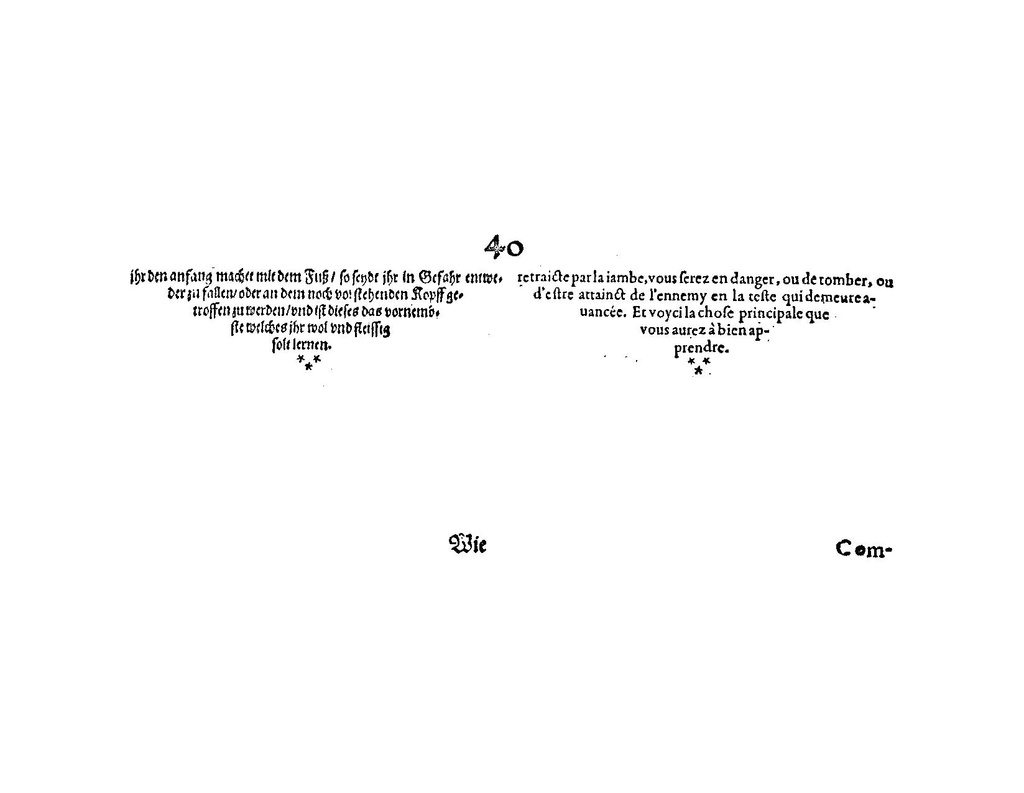 jhr den Anfang machet mit dem Fuß, so seydt jhr in Gefahr entweder zu fallen, oder an dem noch vorstehenden Kopff getroffen zu werden, vnd ist dieses das vornembste welches jhr wol vnd fleissig solt lernen.