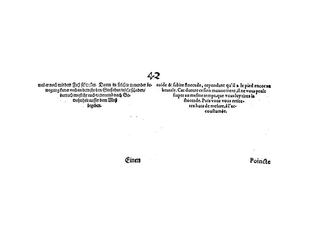 weil er noch mit dem Fuß schwebet. Dann in solcher werender bewegung kan er euch, in dem jhr den Stoß thut, nicht schaden, darnach must jhr euch widerumb nach Gewohnheit ausser dem Maß begeben.