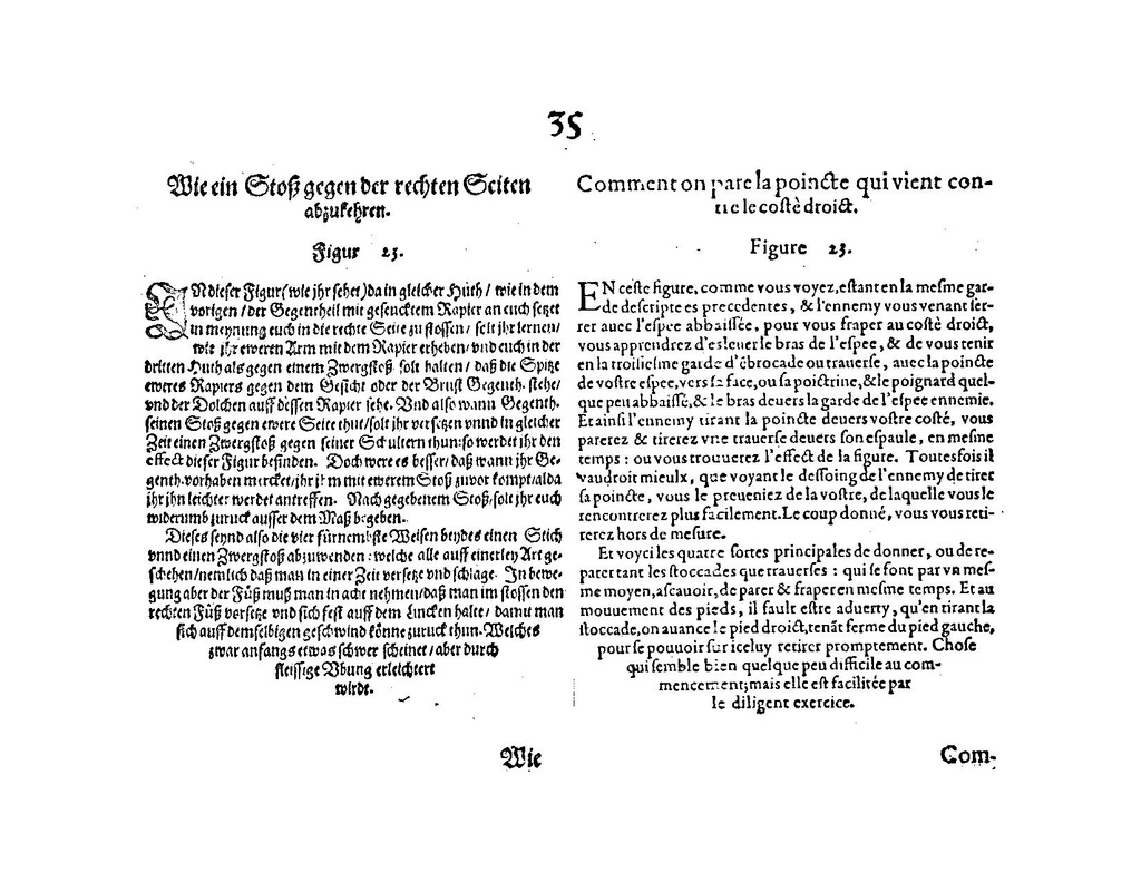 IN dieser Figur (wie jhr sehet) da in gleicher Huth, wie in dem vorigen, der Gegentheil mit gesenktem Rapier an euch setzet in meynung euch in die rechte Seite zu stossen, solt jhr lernen, wie jhr eweren Arm mit dem Rapier erheben, vnd euch in der dritten Huth als gegen einen Zwergstoß solt halten, daß die Spitze eweres Rapiers gegen dem Gesicht oder der Brust Gegenth. stehe, vnd der Dolchen auff dessen Rapier sehe. Vnd also wann Gegenth. seinen Stoß gegen ewere Seite thut, solt jhr versetzen vnnd in gleicher Zeit einen Zwergstoß gegen seiner Schulter thun: so werdet jhr den effect dieser Figur befinden. Doch were es besser, daß wann jhr Gegenth. vorhaben merket, jhr jhm mit ewerem Stoß zuvor kompt, alda jhr jhn leichter werdet antreffen. Nach gegebenem Stoß, solt jhr euch widerumb zuruck ausser dem Maß begeben.