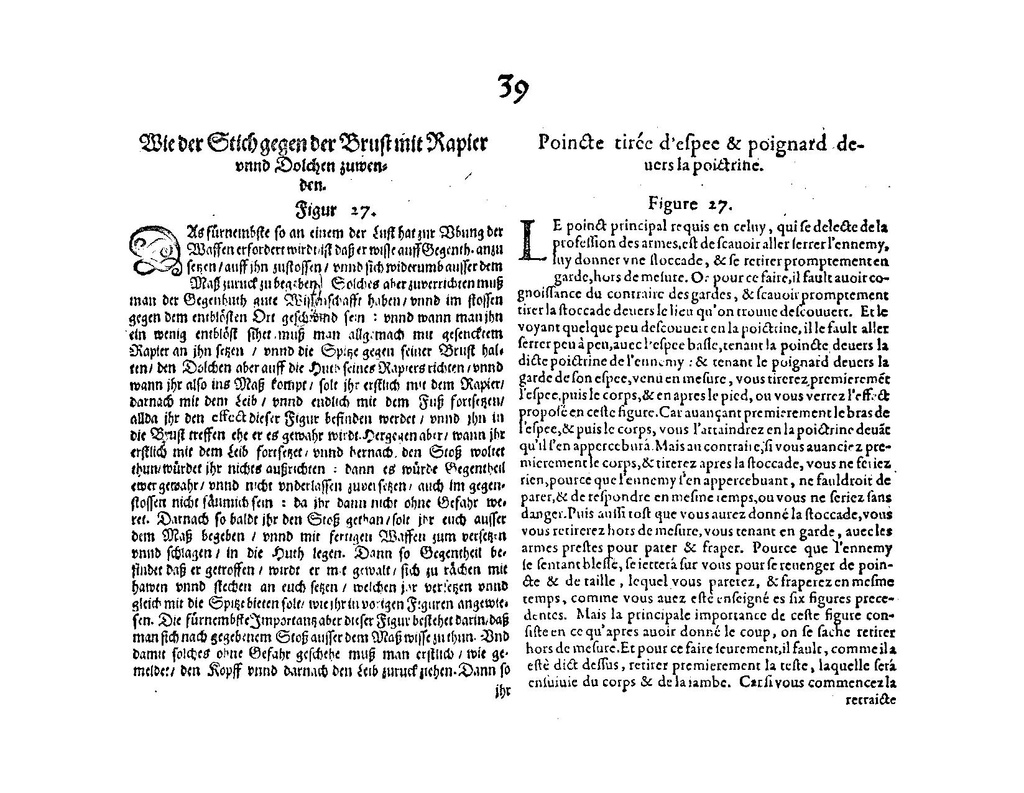 DAs fuͤrnembste so an einem der Lust hat zur Vbung der Waffen erfordert wirdt, ist daß er wisse auff Gegenth. anzusetzen, auff jhn zustoßen, vnnd sich widerumb ausser dem Maß zuruck zu begeben. Solches aber zuverrichten muß man der Gegenhuth gute Wissenschaft haben, vnnd im stossen gegen dem entbloͤsten Ort geschwind sein: vnnd wann man jhn ein wenig entbloͤst sihet, muß man allgemach mit gesencktem Rapier an jhn setzen, vnnd die Spitze gegen seiner Brust halten, den Dolchen aber auff die Huth seines Rapiers richten, vnnd wann jhr also ins Maß kompt, solt jhr erstlich mit dem Rapier, darnach mit dem Leib, vnnd endlich mit dem Fuß fortsetzen, allda jhr den effect dieser Figur befinden werdet, vnnd ihn in die Brust treffen ehe er es gewahr wirdt. Hergegen aber, wann jhr erstlich mit dem Leib fortsetzet, vnnd hernach den Stoß woltet thun, wuͤrdet jhr nichts außrichten: dann es wuͤrde Gegentheil ewer gewahr, vnnd nicht vnderlassen zuversetzen, auch im gegenstossen nicht saͤumich sein: da jhr dann nicht ohne Gefahr weret. Darnach so baldt jhr den Stoß gethan, solt jhr euch ausser dem Maß begeben, vnnd mit fertigen Waffen zum versetzen vnnd schlagen, in die Huth legen. Dann so Gegentheil befindet daß er getroffen, wirdt er mit gewalt, sich zu raͤchen mit hawen vnnd stechen an euch setzen, welchen jhr versetzen vnnd gleich mit die Spitze bieten solt, wie jhr in vorigen Figuren angewiesen. Die fuͤrnembste Jmportanz aber dieser Figur bestehet darin, daß man sich nach gegebenem Stoß ausser dem Maß wisse zu thun. Vnd damit solches ohne Gefahr geschehe muß man erstlich, wie gemelde: den Kopff vnnd darnach den Leib zuruck ziehen. Dann so