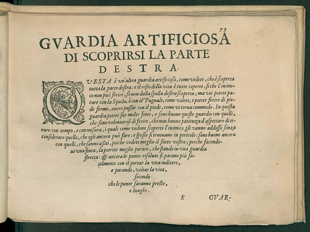 QUESTA è un’altra guardia artificiosa, come vedete, che è scoperta tutta la parte destra: e il resto della vita è tutto coperto, si che l’inimico non può ferire, se non dalla spalla destra scoperta; ma voi potete parare con la Spada, ò con il Pugnale, come volete, e potete ferire di piede fermo, overo passar con il piede, come vi torna commodo.