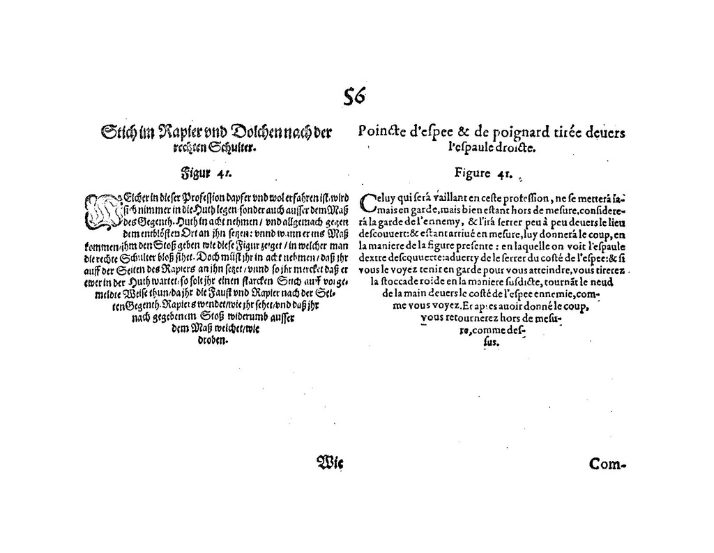 WElcher in dieser Profession dapfer vnd wol erfahren ist, wird sich nimmer in die Huth legen sonder auch ausser dem Maß des Gegenth. Huth in acht nehmen, vnd allgemach gegen dem entbloͤsten Ort an jhn setzen: vnnd wann er ins Maß kommen, jhm den Stoß geben, wie diese Figur zeiget, in welcher man die rechte Schulter bloß sihet. Doch muͤst jhr in acht nehmen, das jhr auff der Seiten des Rapiers an jhn setzet, vnnd so jhr merket daß er ewer in der Huth wartet so solt jhr einen starken Stich auff vorgemeldte Weise thun, da jhr die Faust vnd Rapier nach der Seiten Gegenth. Rapier wendet, wie jhr sehet, vnd das jhr nach gegebenem Stoß widerumb ausser dem Maß weichet, wie droben.
