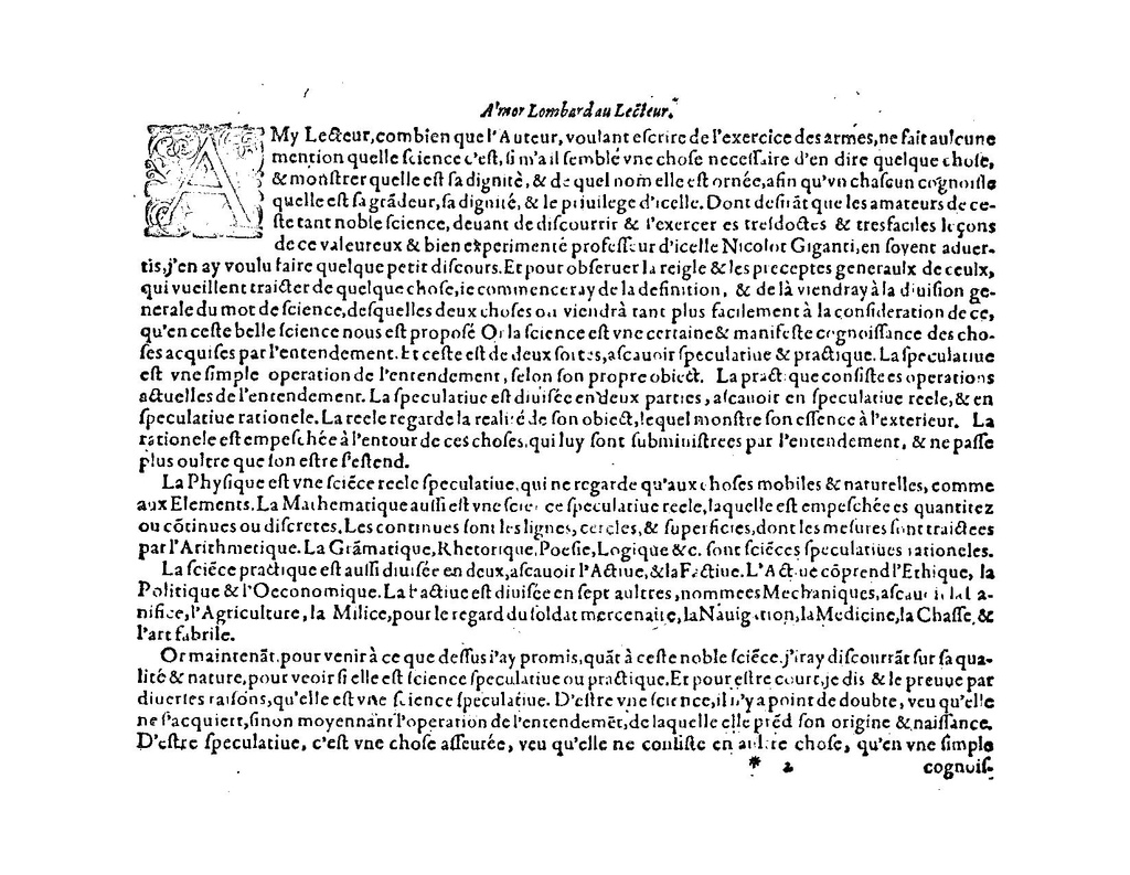 AMy Lecteur, combien que l’Auteur, voulant escrire de l’exercice des armes, ne fait aulcune mention quelle science c’est, si m’a il semblé vne chose necessaire d’en dire quelque chose, & monstrer quelle est sa dignité, & de quel nom elle est ornée, afin qu’vn chascun cognoiste quelle est sa grãdeur, sa dignité, & le priuilege d’icelle. Dont desuãt que les amateurs de ceste tant noble fcicnce, deuant de discourrir & l’exercer es tresdoctes & tresfaciles leçons de ce valeureux & bien experimenté professeur d’icelle Nicolot Giganti, en soyent aduertis, j’en ay voulu faire quelque petit discours. Et pour obseruer la reigle & les preceptes generaulx de ceulx, qui vueillent traicter de quelque chose, ie commenceray de la definition, & de là viendray à la diuision generale du mot de science, desquelles deux choses on viendrà tant plus facilement à la consideration de ce, qu’en ceste belle science nous est proposé Or la science est vne certaine & manifeste cognoissance des choses acquises par l’entendement. Et ceste est de deux soites, ascauoir speculariue & practique. La speculatiue est vne simple operation de l’entendement, selon son propre obiect. La practique consistees operations actuelles de l’entendement. La speculatiue est diuisée en deux parties, ascauoir en speculatiue reele, & en speculatiue rationele. La reele regarde la realiré de son obiect, lequel monstre son essence à l’exterieur. La rationele est empeschée à l’entour de ces choses qui luy sont subministrees par l’entendement, & ne passe plus oultre que son estre s’estend.