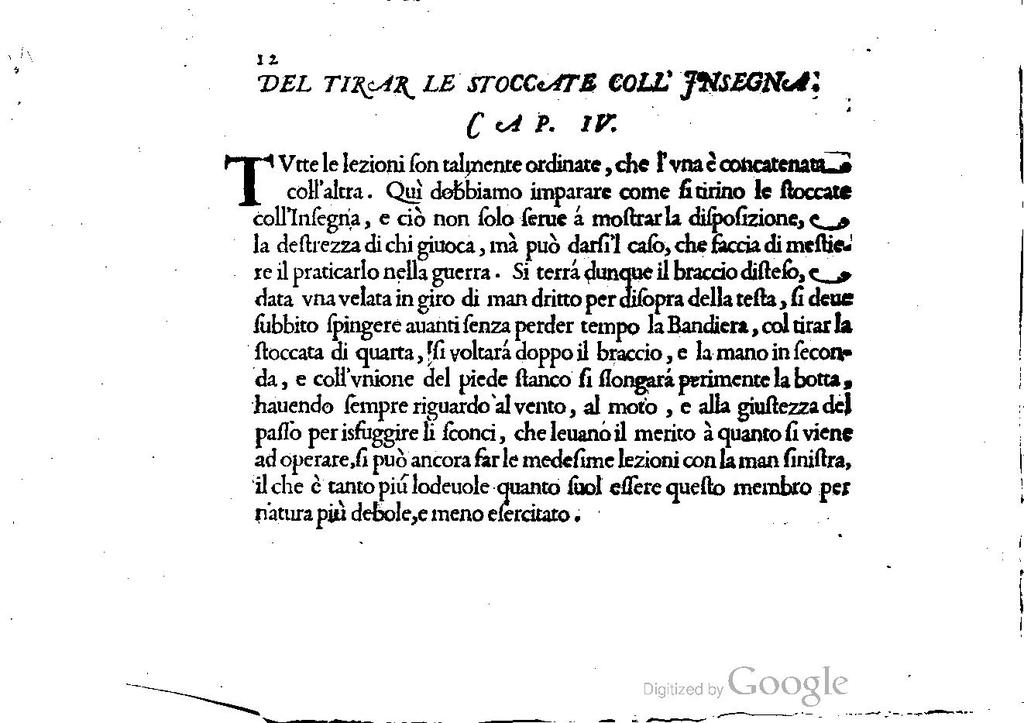 TUtte le lezioni sono talmente ordinate che lʼuna è concatenata collʼaltra. Qui, dobbiamo imparare come si tirino le stoccate collʼInsegna, e ciò non solo serve a mostrare la disposizione e la destrezza di chi giuoca, ma può darsi caso che faccia di mestiere praticarlo nella guerra. Si terrà dunque il braccio disteso, e data una velata in giro di man dritto per disopra della testa, si deve subito spingere avanti senza perder tempo la Bandiera, col tirar la stoccata di quarta, si. voltarà. doppo il braccio, e la mano in seconda, e collʼunire il piede stanco si slongarà parimenti la botta, avendo sempre riguardo al vento, al moto e alla giustezza del passo per isfuggire gli sconci, che levano il merito a quanto si viene ad operare. Si può ancora fare le medesime lezioni con la mano sinistra, il che è tanto più lodevole quanto suol essere questo membro per natura più debole e meno esercitato.